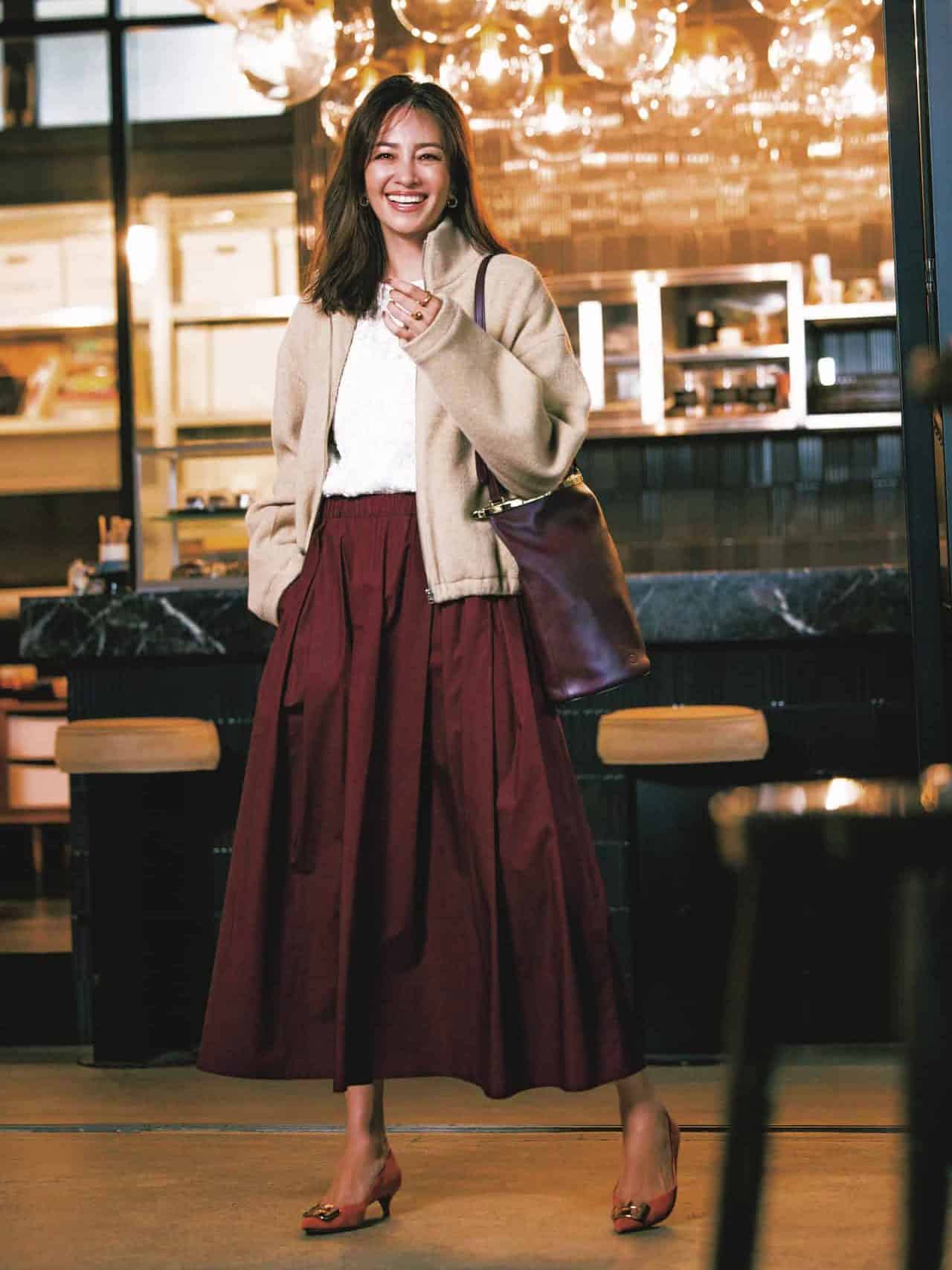 もこもこブルゾンは、エレガントなスカートで通勤もOK