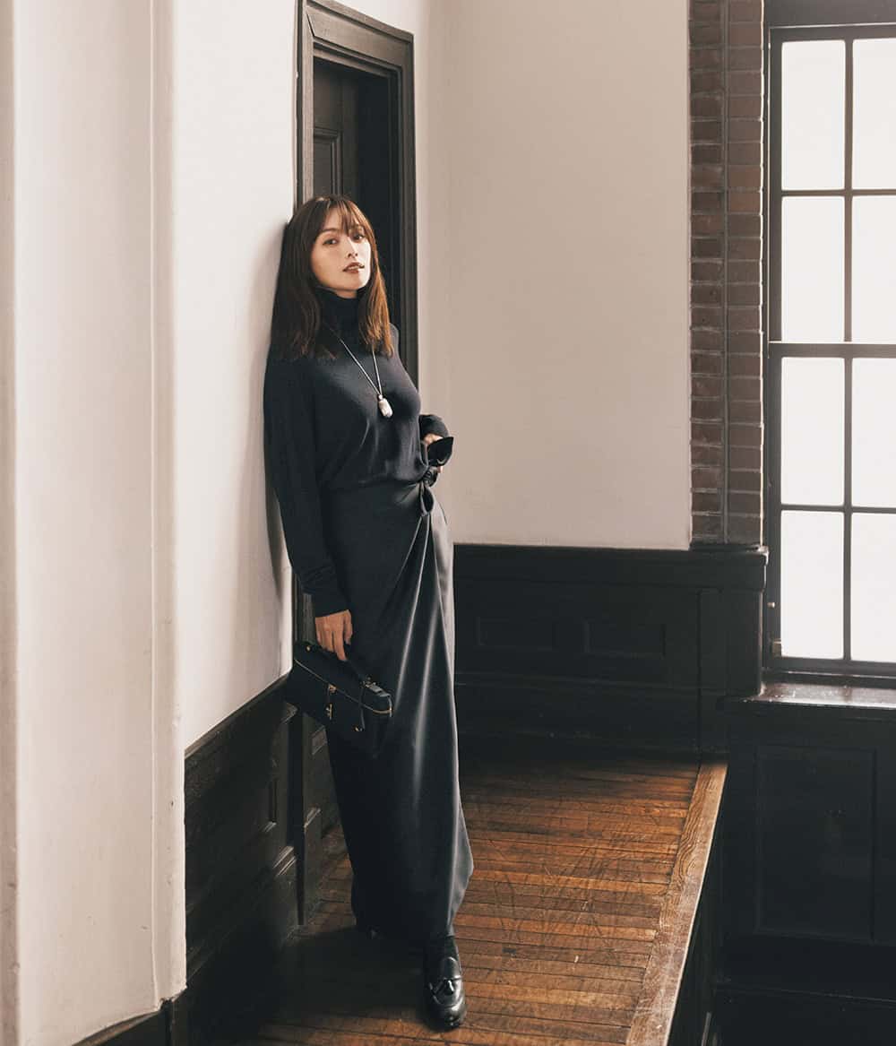 「気品と媚びない強さ……、着た瞬間、肌に溶け込むようなブラックニットは、シンプルなのに不思議とドラマティックな気分にしてくれる。ロロ・ピアーナのモノづくりに敬意を払って生涯の相棒に」(モデル・蛯原さん)