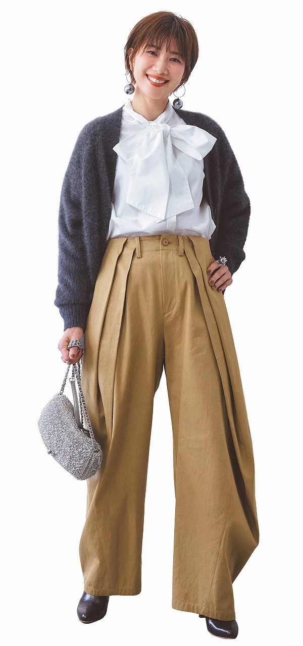 大ぶりリボンが印象的な白ブラウスを、ベージュパンツでハンサムに引き算。ふわっとカーデを重ねて、可愛げと余裕を演出。フェミニンディテールを品よく楽しむ、大人の好バランスです。