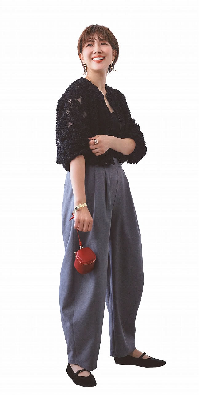 立体感のある黒カーデにグレーパンツでクールな抜け感を。もこもこ素材&コンパクトフォルムが、バレルパンツを女らしく昇華。小さな赤バッグで差し色を添えて華やかさをひとさじ。