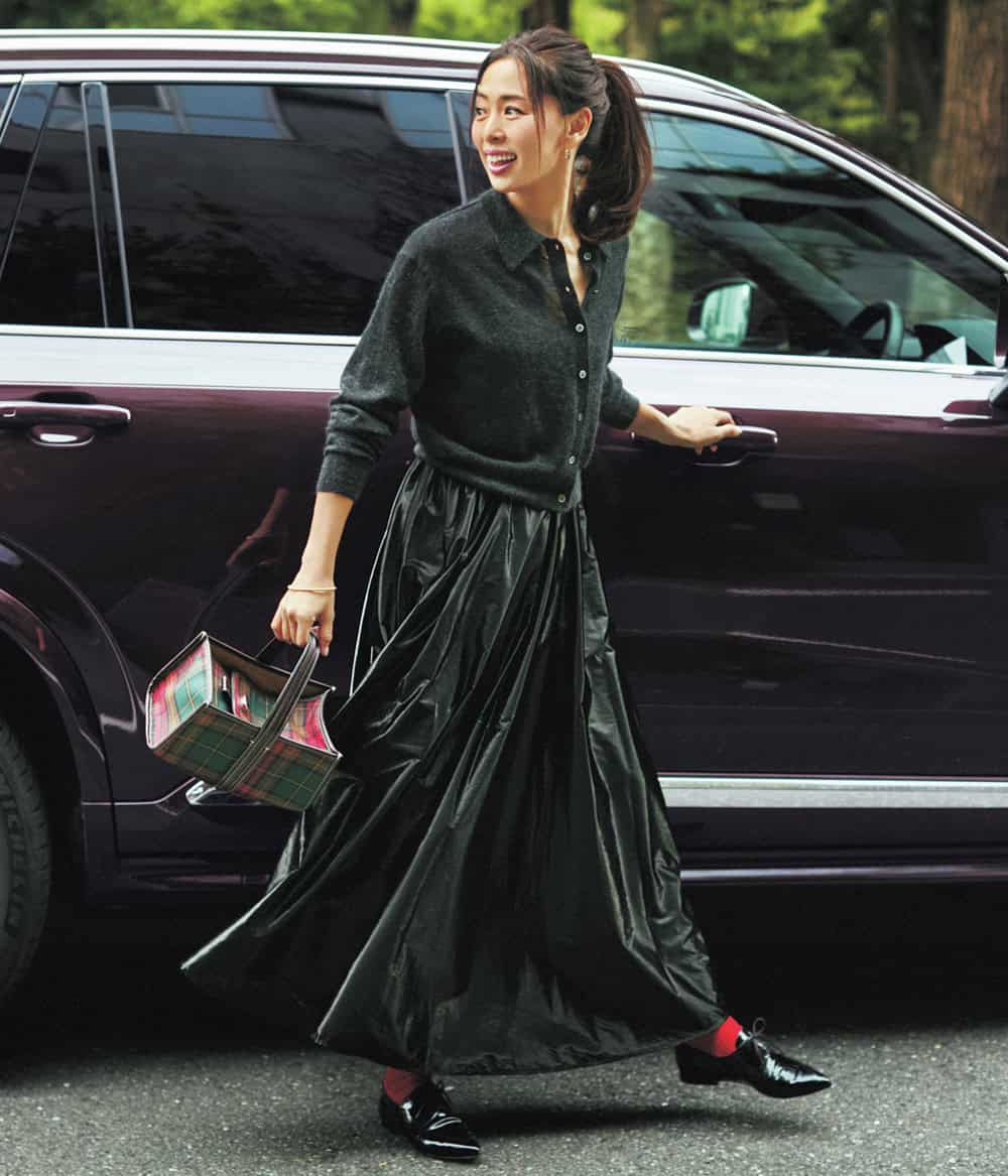 仕事→送迎でのママ友間で馴染むオシャレといえばやっぱり“ほぼ黒”! きちんと見えする衿付きニットは霜がかかったような風合いのグレイッシュなブラック。甘さマイナス、リッチ見えする光沢感のボリュームスカートで今っぽさを。小面積でもスパイスになる赤を効かせて“黒づくめ”とは一線を画すコーデに。