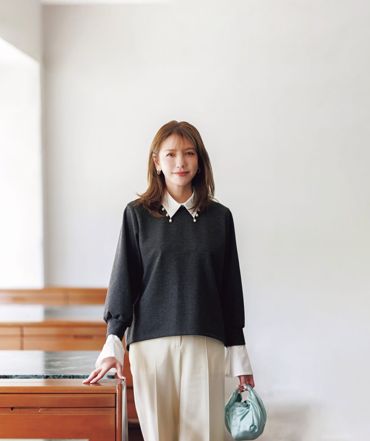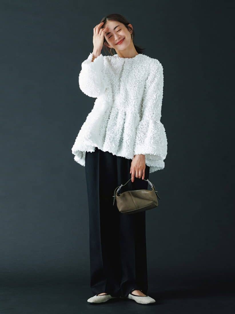 パール衿プルオーバー¥18,700(シークレット・トロフィー)パンツ¥37,400(デ・プレ)バッグ¥22,000(テンドレススタジオ/デ・プレ)ピアス¥28,050(CHIRO JEWELRY/ロードス)