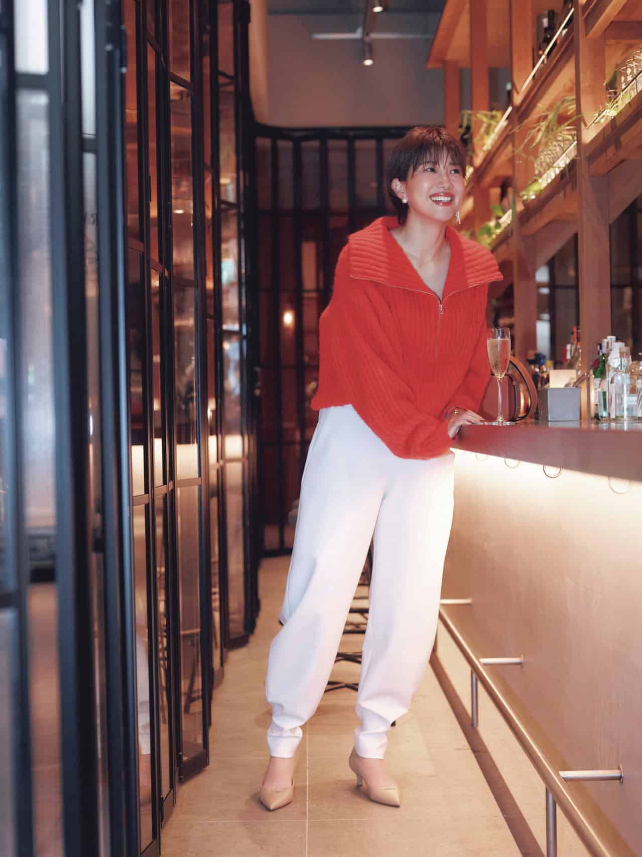 パンツ¥29,700(ル フィル)ニット¥49,500(ザ シンゾーン/シンゾーン ルミネ有楽町店)バッグ¥121,000〈ルッツ モリス〉靴¥59,400〈ペリーコ〉(ともにアマン)ピアス¥66,000(カラットアー/イセタンサローネ東京)ネックレス¥33,000(マリハ)リング¥24,200(ココシュニック オンキッチュ/ココシュニック)