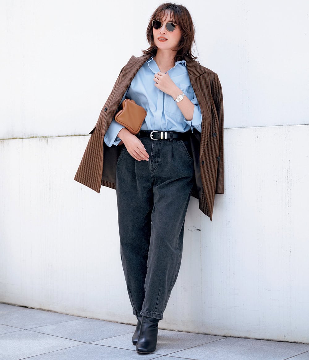 バレルの丸み×ジャケットの直線を掛け合わせて最旬シルエットに。パンツ/ZARAニット¥59,400(アロー)ジャケット¥36,300(ザ ポーズ/ウィム ガゼット ルミネ新宿店)シャツ¥23,100(アンクレイヴ/オンワード樫山)ブーツ¥28,600(ダイアナ/ダイアナ 銀座本店)ベルト¥19,800(チノ/モールド)バッグ、サングラス、時計(すべて私物)