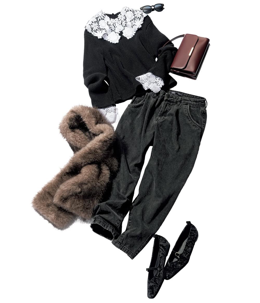 ★ コーデ1:レース衿やファーでクラシカルな気分を纏って