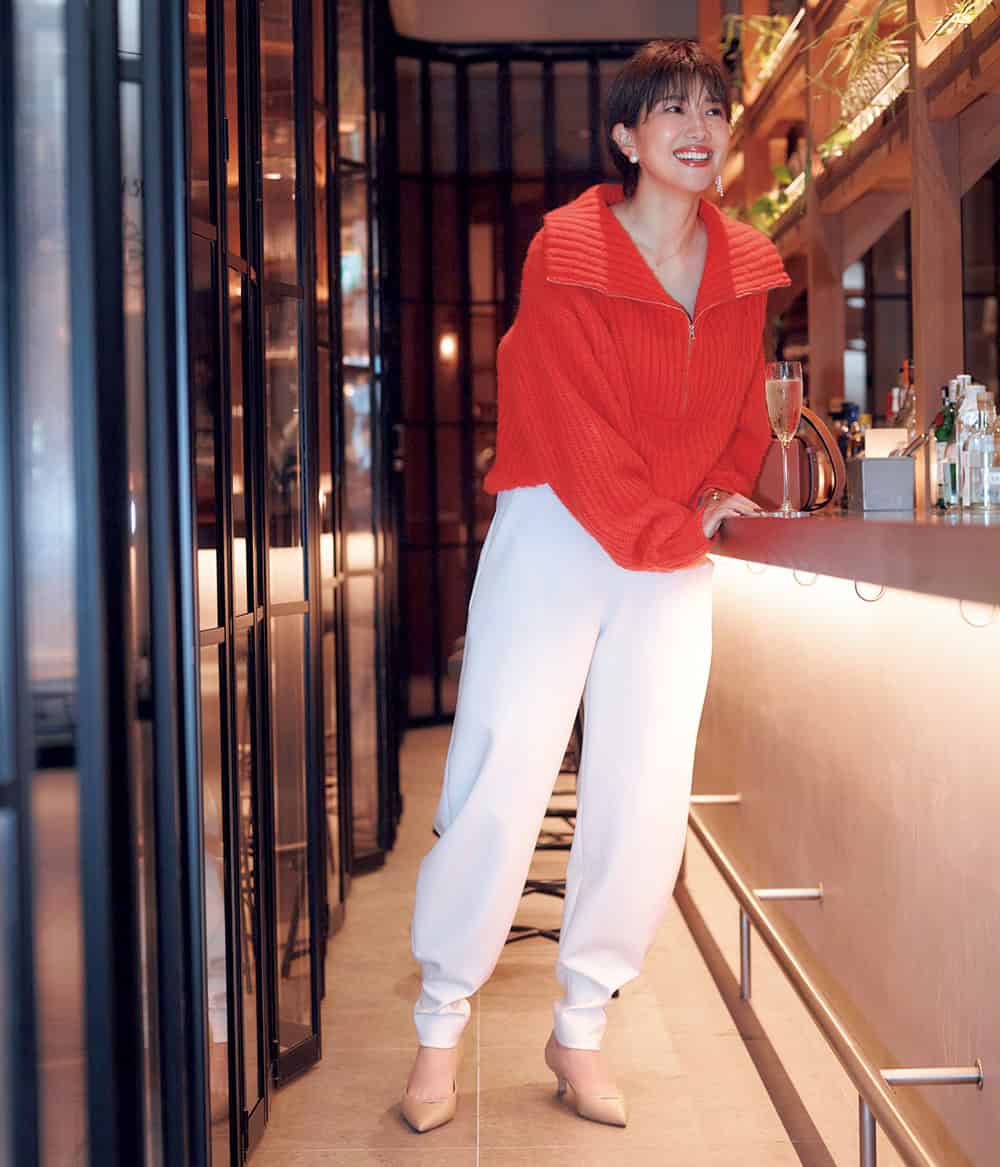 パンツ¥29,700(ル フィル)ニット¥49,500(ザ シンゾーン/シンゾーン ルミネ有楽町店)バッグ¥121,000〈ルッツ モリス〉靴¥59,400〈ペリーコ〉(ともにアマン)ピアス¥66,000(カラットアー/イセタンサローネ東京)ネックレス¥33,000(マリハ)リング¥24,200(ココシュニック オンキッチュ/ココシュニック)