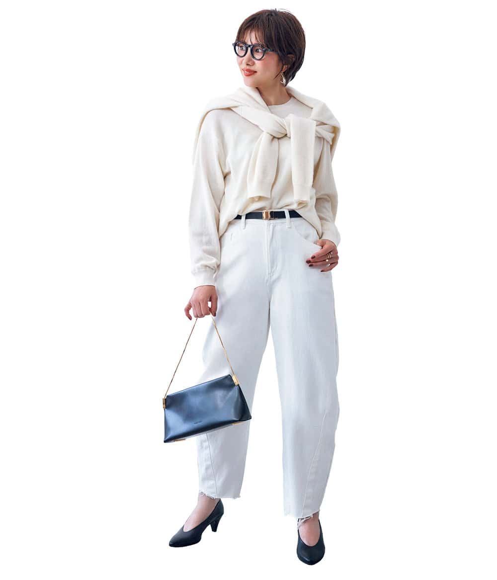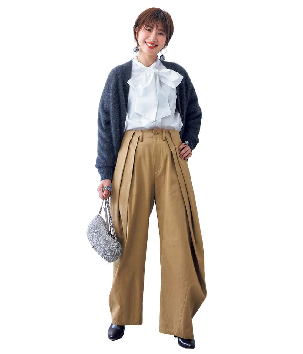 パンツ¥17,600(カデュネ/カデュネ プレスルーム)ニット¥31,900カーディガン¥36,300(ともにフローレント)バッグ¥75,900(マエストソ/アマン)靴¥36,300(ファビオ ルスコーニ/伊勢丹新宿本店 本館2階 婦人靴)ベルト¥12,100(レフィエ/プルミエ アロンディスモン NEWoMan新宿)メガネ¥42,900(アイヴァン/アイヴァン 東京ギャラリー)ピアス¥22,000リング¥18,700(ともにJouete)