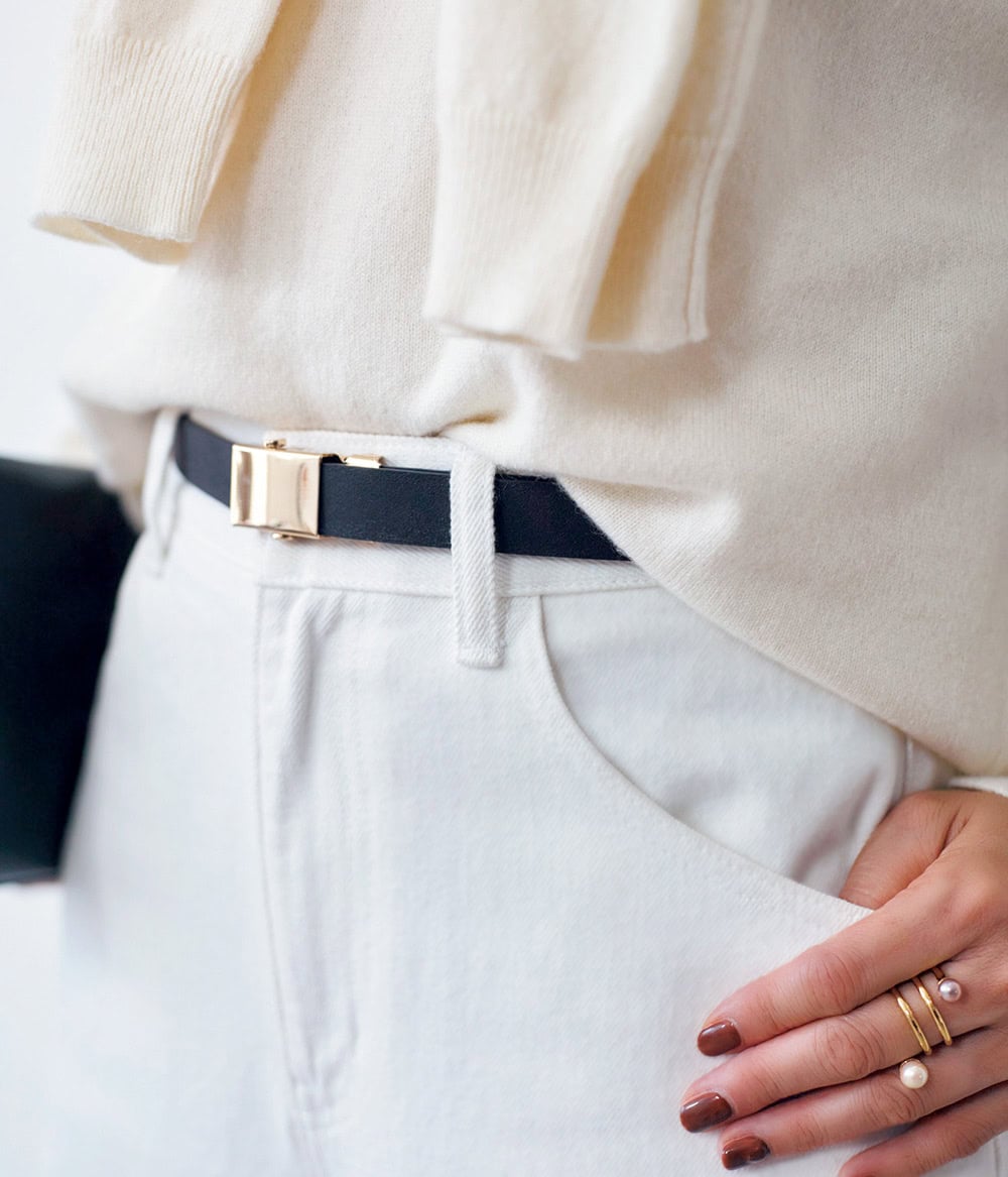ベルトがきちんと映える『ハイウエストデザイン』。ワントーンコーデもメリハリよくきまります。