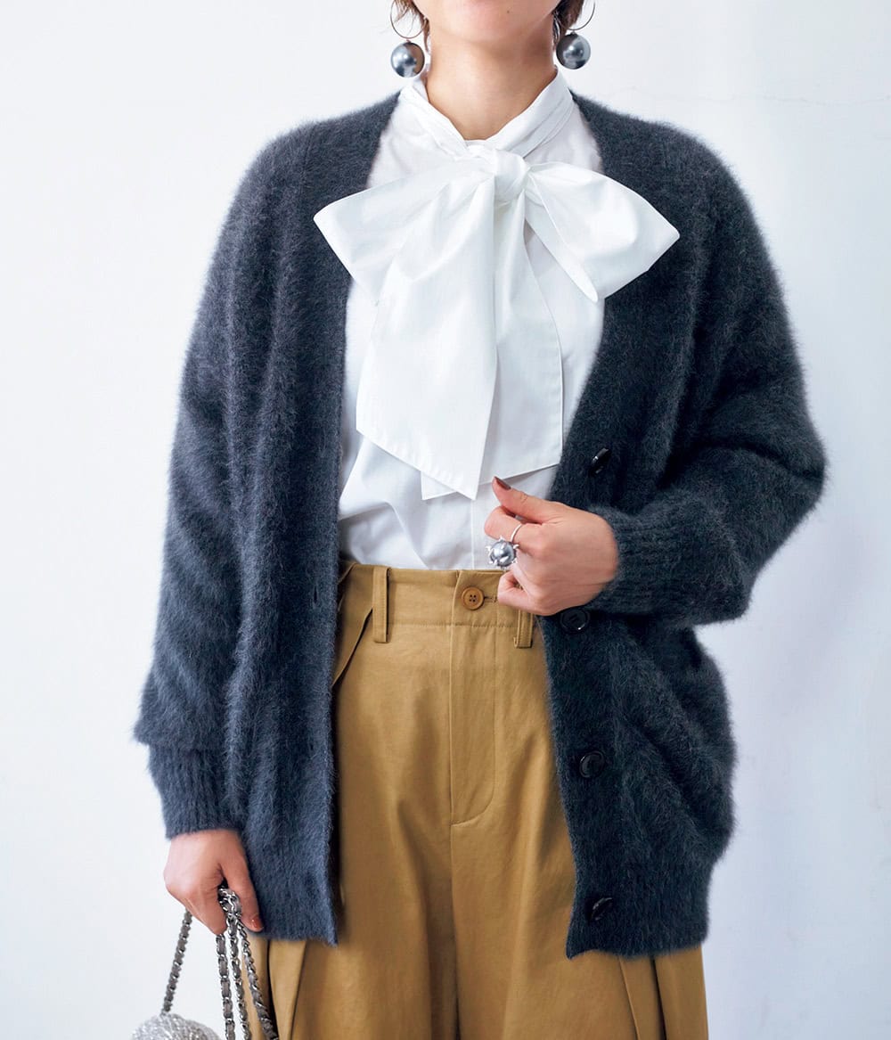 パンツ¥33,990(アストラット/アストラット 新宿店)カーディガン¥37,400(マルティニーク/マルティニーク ルミネ横浜)ブラウス¥29,700(アマカ/SANYO SHOKAI カスタマーサポート)バッグ¥79,200(アンテプリマ/ワイヤーバッグ/アンテプリマジャパン)ブーツ¥31,900(ダイアナ/ダイアナ 銀座本店)ピアス¥29,700リング¥42,900(ともにジャスティン デイビス/ジャック・オブ・オール・トレーズ プレスルーム)