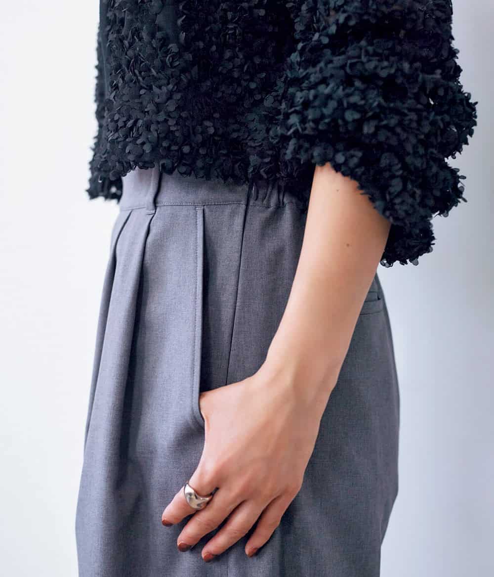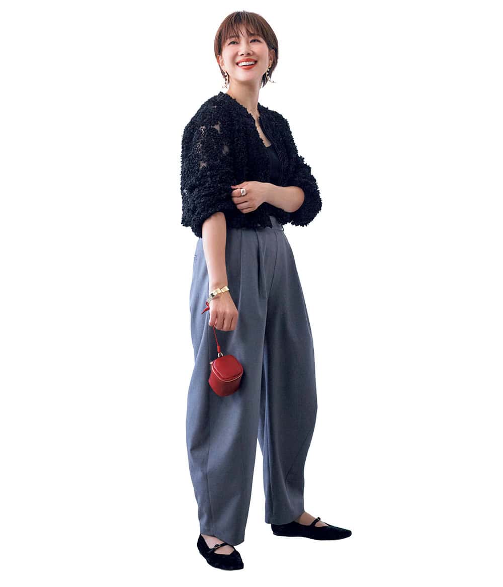 パンツ¥22,000(カデュネ/カデュネ プレスルーム)ジャケット¥44,000〈エストネーション〉ニット¥38,500〈コラム〉(ともにエストネーション)バッグ¥20,900(マユコ)靴¥35,200(ペリーコ サニー/アマン)ピアス¥77,000(カラットアー/イセタンサローネ東京)ネックレス¥22,000(マリハ)リング¥22,000(ete)