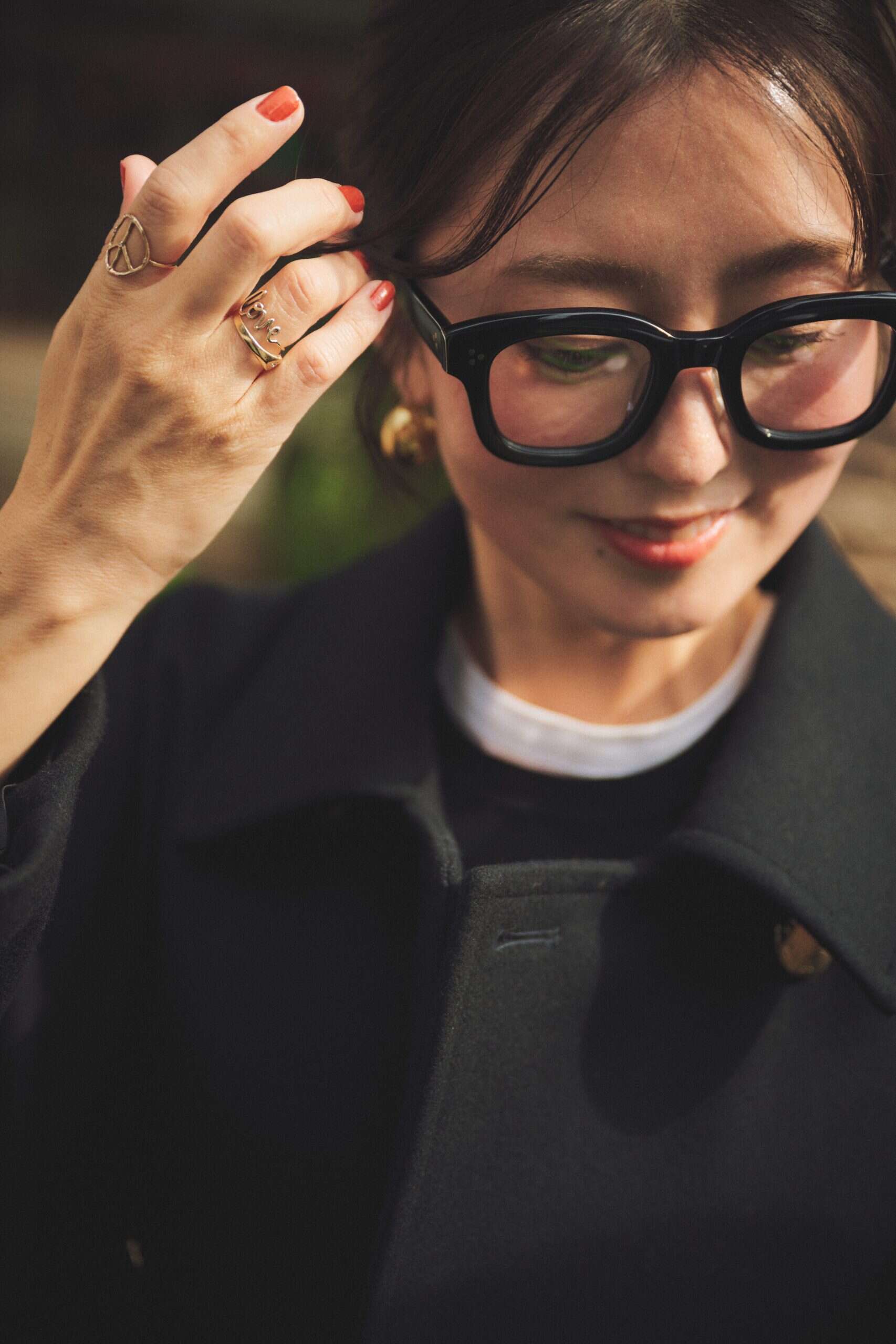 ずっと“欲しいものリスト”にあったマッキントッシュのハンビーコートを今年お迎えしました。長く使えそうなAラインのテント型で、低身長でもバランス良く着られ、地味になり過ぎない金ボタンがトラッドな雰囲気で気に入っています。コートが主役になるように敢えてシンプルにしたく、ニット×デニムにローファーで合わせました。黒縁メガネで遊びをプラスして、大人のトラッドスタイルに仕上げました。