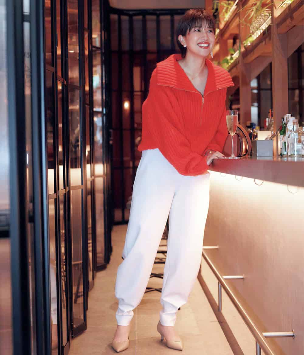 パンツ¥29,700(ル フィル)ニット¥49,500(ザ シンゾーン/シンゾーン ルミネ有楽町店)バッグ¥121,000〈ルッツ モリス〉靴¥59,400〈ペリーコ〉(ともにアマン)ピアス¥66,000(カラットアー/イセタンサローネ東京)ネックレス¥33,000(マリハ)リング¥24,200(ココシュニック オンキッチュ/ココシュニック)