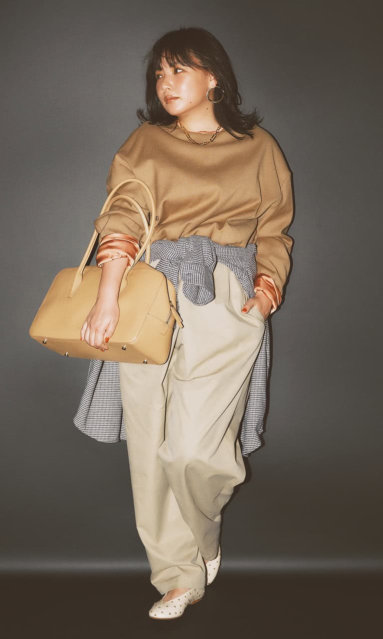 ベージュ系ワントーンなら、スウェットもやわらかく上品に。大ぶりアクセで視線を上へ集めれば、ゆるパンツもすっきり見えします。腰まわりを隠すシャツのレイヤードで、体型カバーと奥行きまでしっかり確保。