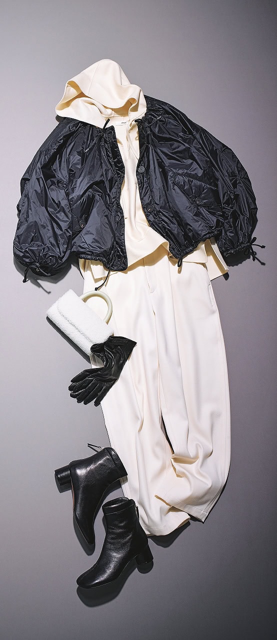 上質ウールの白ワントーンに、構築的な黒ショートブーツでキレをひとさじ。フーディ&シャカシャカアウターでカジュアルに寄せつつ、足元で全体をピリッとまとめたコーデです。