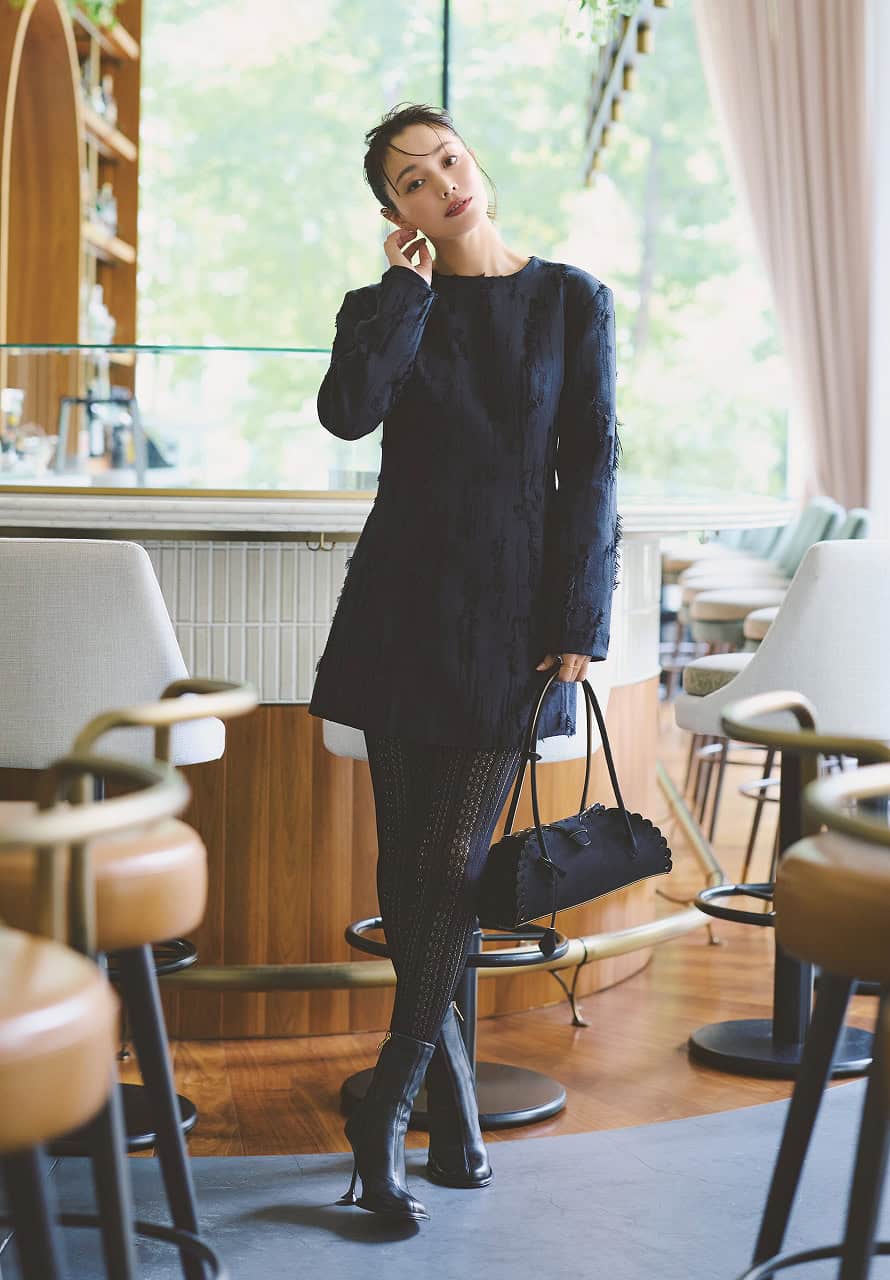 ワンピース¥21,780(ゴスペル/ザ・ウォール ショールーム)バッグ¥47,300(メアリ・オル・ターナ/トゥモローランド)ショ{hlb}ートブーツ¥191,400(セルジオ ロッシ/セルジオ ロッシ ジャパン カスタマーサービス)ハートピアス¥92,400ハートイヤーカフ¥145,200 ボンドイヤーカフ¥50,600(すべてプライマル)ダブルリング¥23,100(マユ/マユ ショールーム)タイツ(スタイリスト私物)