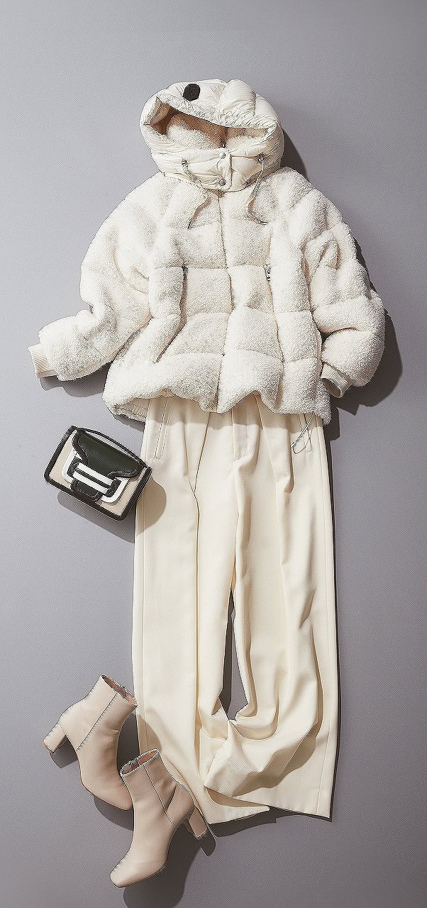 ボアアウターのもこもこ感に、オフホワイトのショートブーツで気品をプラス。白トーンでものっぺりせず、素材のリズムで軽やかにまとまる冬の洗練コーデです。