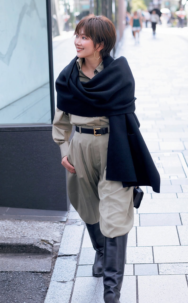 ストール付きコート¥253,000パンツ¥52,800(ともにサヴィル サヴィ)カットソー¥13,200(アンクレイヴ/オンワード樫山 お客様相談室)バッグ¥74,800(カルボッティ/essence of ANAYI)ブーツ¥121,000(ダブルスタンダードクロージング/フィルム)ベルト¥17,600(レフィエ/フラッパーズ)サングラス¥48,400(プロポ/プロポデザイン)