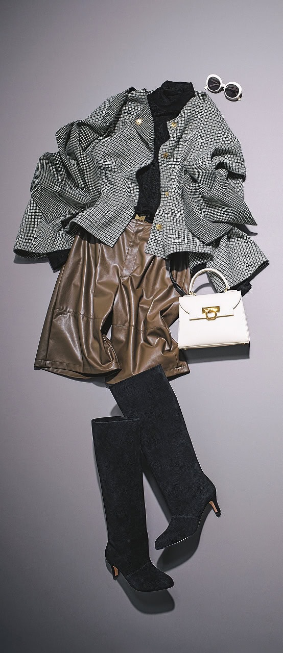 チェック柄のショート丈コートには、ロングブーツを合わせてシルエットを整えて。ぐっと旬顔にアップデートされます。色味はシックに抑えて、大人の落ち着きと着映えを両得した着こなしに。