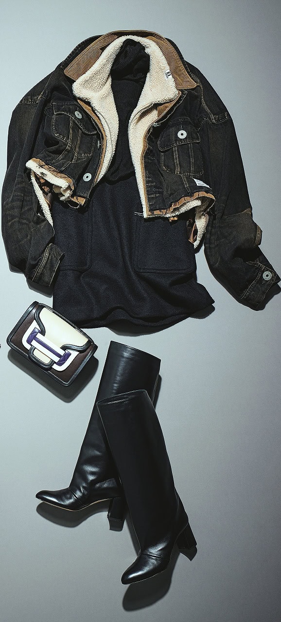 ほぼクロの端正なコーデに、ロングブーツの重厚感がマッチ。レイヤード風デニムJKで遊び心をプラスすれば、きれいめ×エッジの絶妙バランスに。年末のお出かけにも活躍できそう。