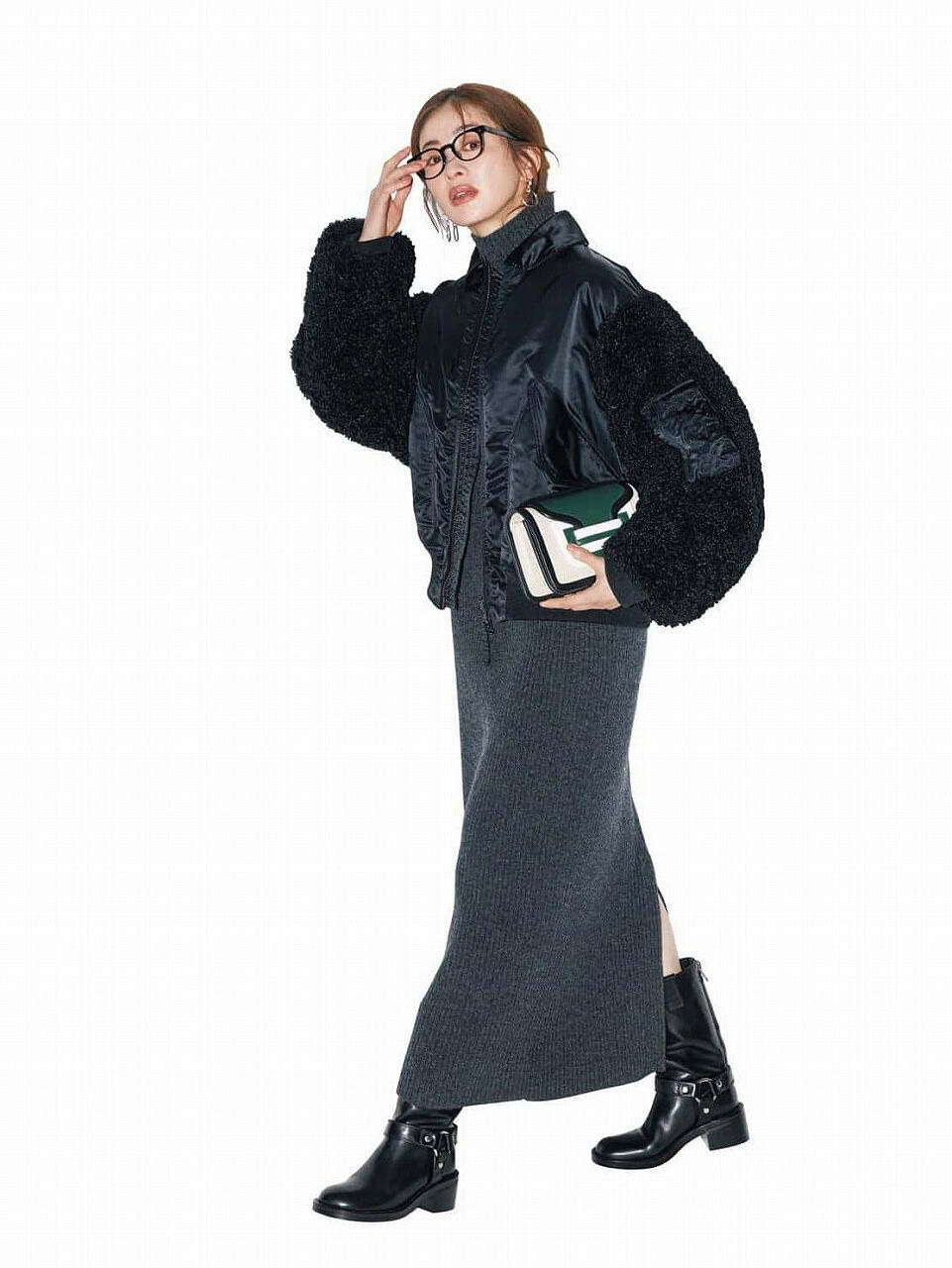 ブルゾン¥94,600(ハイク/ボウルズ)ワンピース¥53,900(サクラ/インターリブ)バッグ¥157,300(ピエール アルディ/ピエール アルディ 東京)ブーツ¥79,200(PIPPICHIC/ベイジュ)メガネ¥42,900(プロポ/プロポデザイン)ピアス¥30,800(ブランイリス/ブランイリス トーキョー)