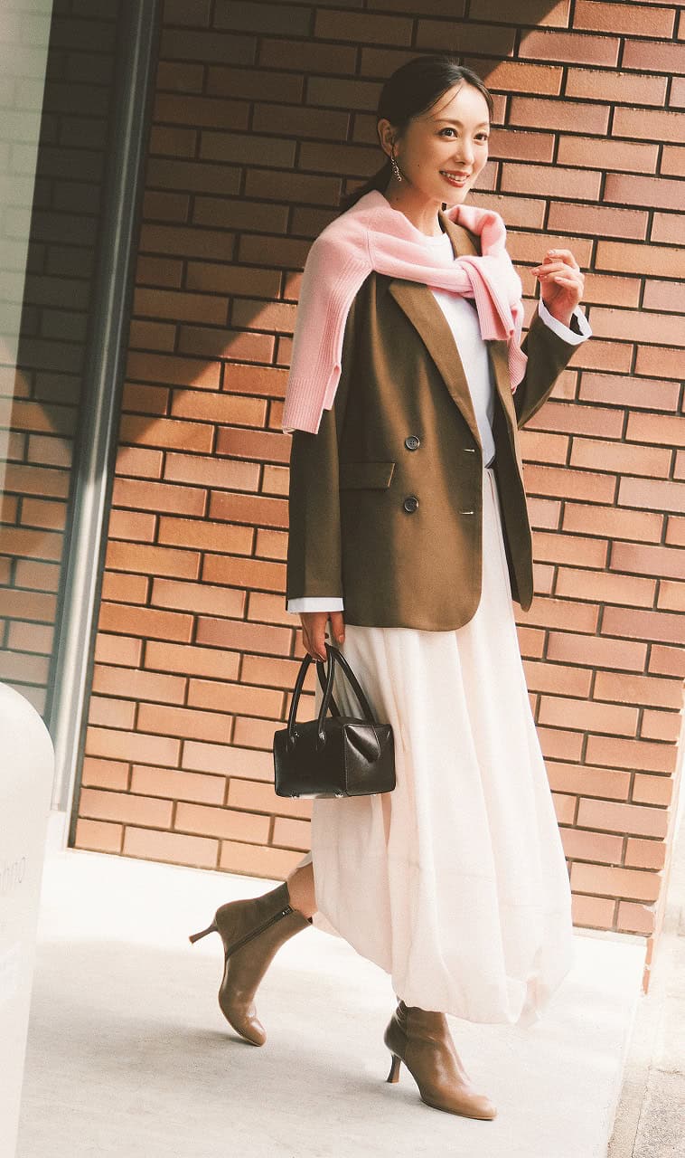オーバージャケットのボリュームを、ショートブーツのシャープさで引き締めて。バルーンスカートの揺れ感にほどよく重さを添え、女性らしい気品を纏った着こなしに。