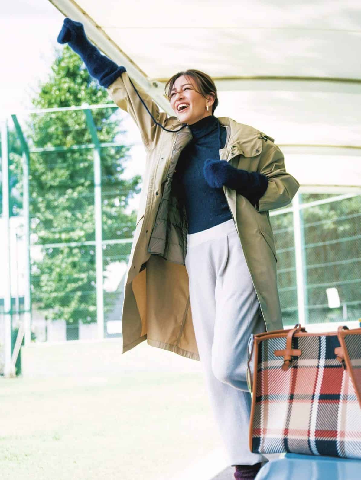 ミリタリージャケット¥77,000(ロエフ/エイチ ビューティ&ユース)カーディガン¥31,900(ebure/リトルリーグ インク)ボウタイブラウス¥25,300(ウィム ガゼット/ウィム ガゼット 玉川髙島屋S・C店)パンツ¥55,000(ハイク/ボウルズ)バッグ¥40,700ストラップ¥9,900(ともにジャンニ キアリーニ/ジャンニ キアリーニ 銀座店)スニーカー¥44,000(デイト/ティースクエア プレスルーム)