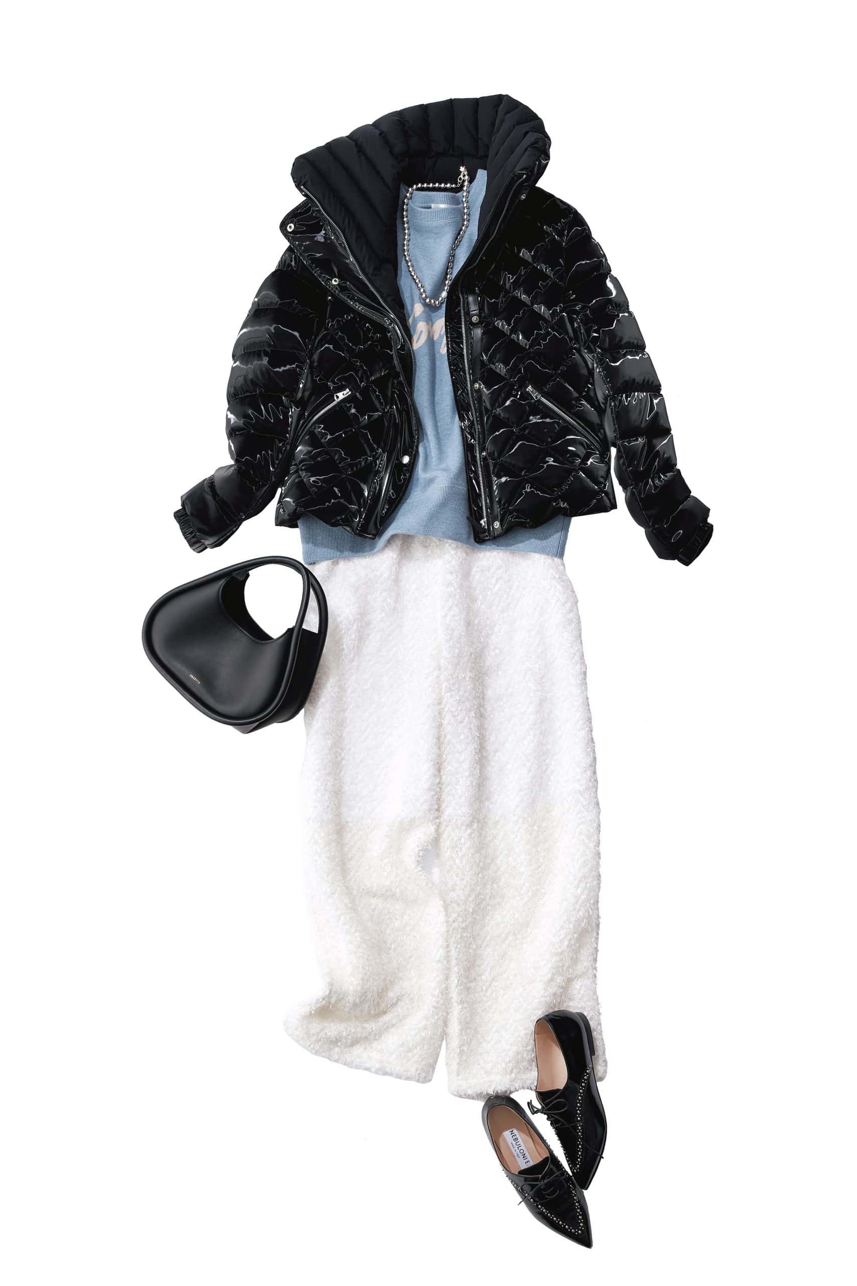 冬を感じさせる、真っ白なふわふわパンツがコーデを盛り上げます。甘パンツには、あえて辛さのある黒ダウンをあわせて今年大人気の甘辛なビジュアルに。襟がしっかりと立ったデザインなので安心感抜群です。