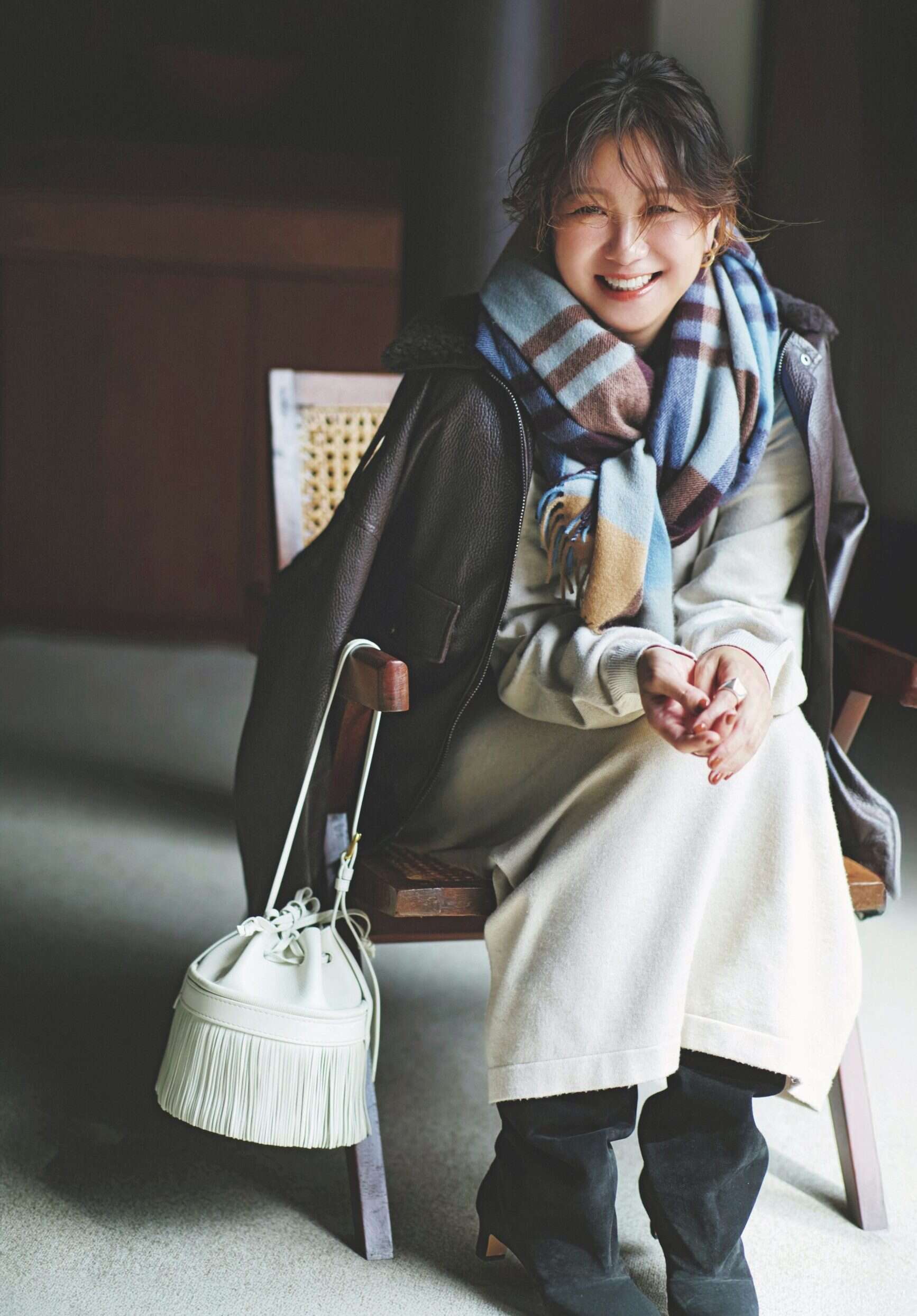 ボアブルゾン[FIRST DOWN×styling/]¥42,900(styling//styling/ ルミネ新宿1店)ニット¥16,500(ランバン オン ブルー)パンツ¥9,900(Mila Owen/Mila Owen ルミネ新宿2店)腰巻きしたシャツ¥20,900(アルページュストーリー)バッグ紺¥17,600(NOMADIS/ドレステリア 渋谷スクランブルスクエア店)バッグ黒¥44,000(メアリ オル ターナ/AL Design Inc.)メガネ¥42,900(プロポ/プロポデザイン)ピアス¥33,000(リューク)
