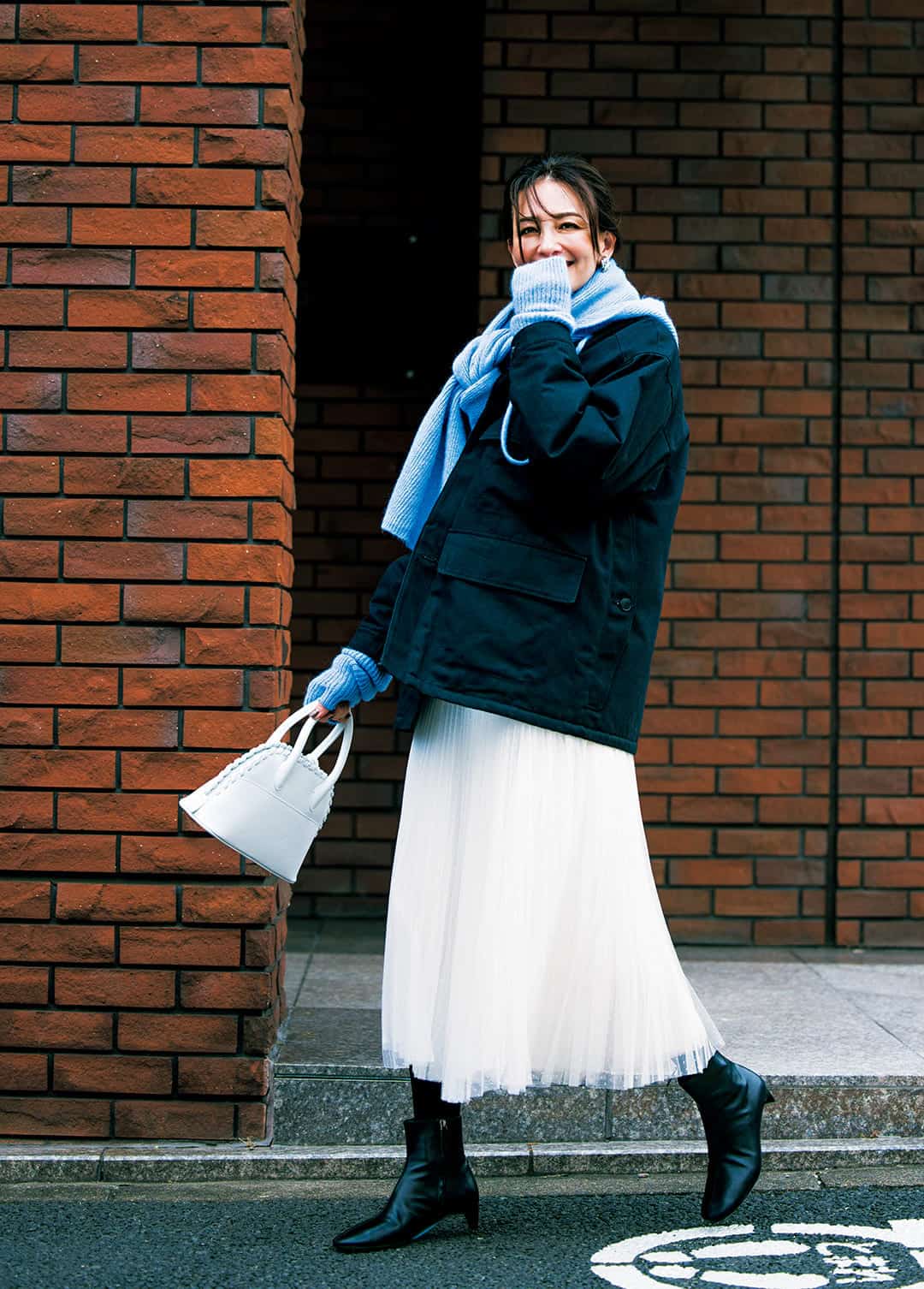 防寒アウターの代表格であるミリタリージャケットは、実は甘めスカートにもどんなボトムスにも馴染むんです。首元のマフラーは、寒さ対策とメリハリアップを兼ねた差し色を選ぶのがおすすめです。