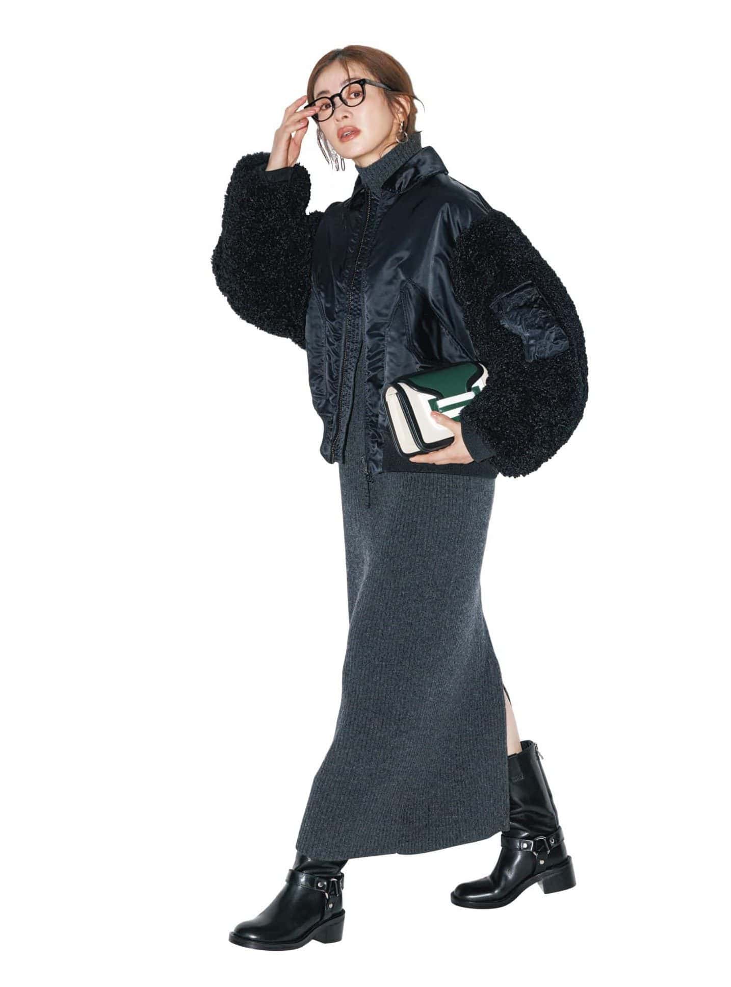 ブルゾン¥94,600(ハイク/ボウルズ)ワンピース¥53,900(サクラ/インターリブ)バッグ¥157,300(ピエール アルディ/ピエール アルディ 東京)ブーツ¥79,200(PIPPICHIC/ベイジュ)メガネ¥42,900(プロポ/プロポデザイン)ピアス¥30,800(ブランイリス/ブランイリス トーキョー)