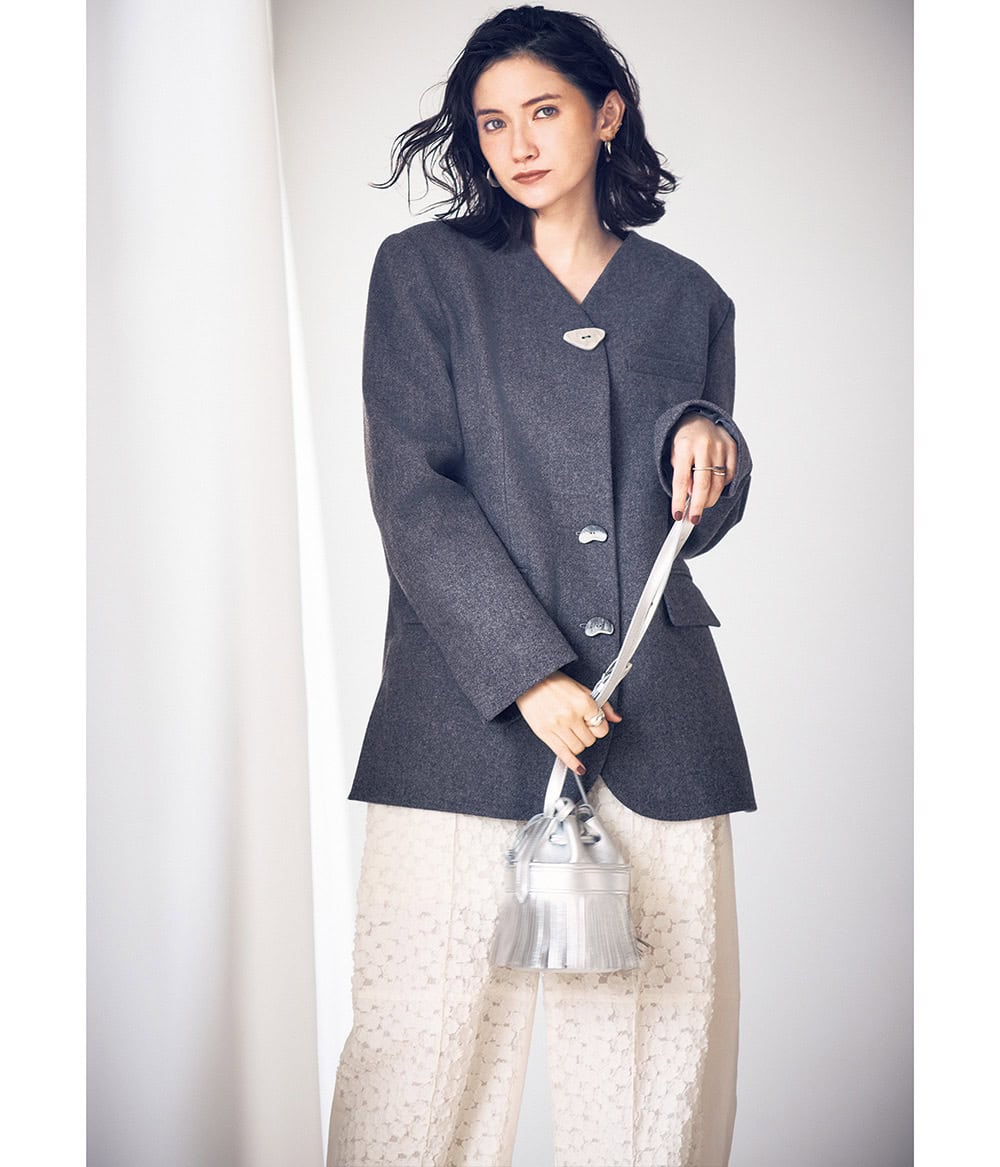 コート¥140,800(アキン/エディットユナイテッドアローズ梅田店)パンツ[11月発売予定]¥46,200(カレンソロジー/カレンソロジー二子玉川)バッグ¥130,900(J&M デヴィッドソン/J&M デヴィッドソン カスタマーセンター)ピアス¥31,900リング[左手]¥35,200(ともにブランイリス/ブランイリス トーキョー)リング[右手]¥28,600(Raza/ロードス)
