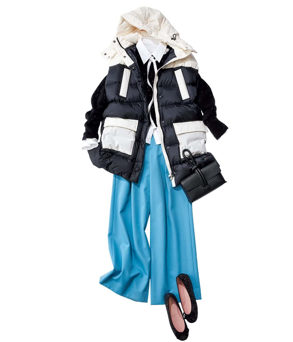<コーデ例>ブラックダウンジャケット¥184,800(マッカージュ/ジェイプラスインターナショナル)リブニット¥46,200ワイドパンツ¥29,700(ともにウィム ガゼット/ウィム ガゼット 玉川髙島屋S・C店)バッグ¥64,900(MIUUR/ショールーム セッション)パンプス[10月末発売予定]¥28,600(ツル バイ マリコ オイカワ)チェーンネックレス¥15,400(ダブルスタンダードクロージング/フィルム)