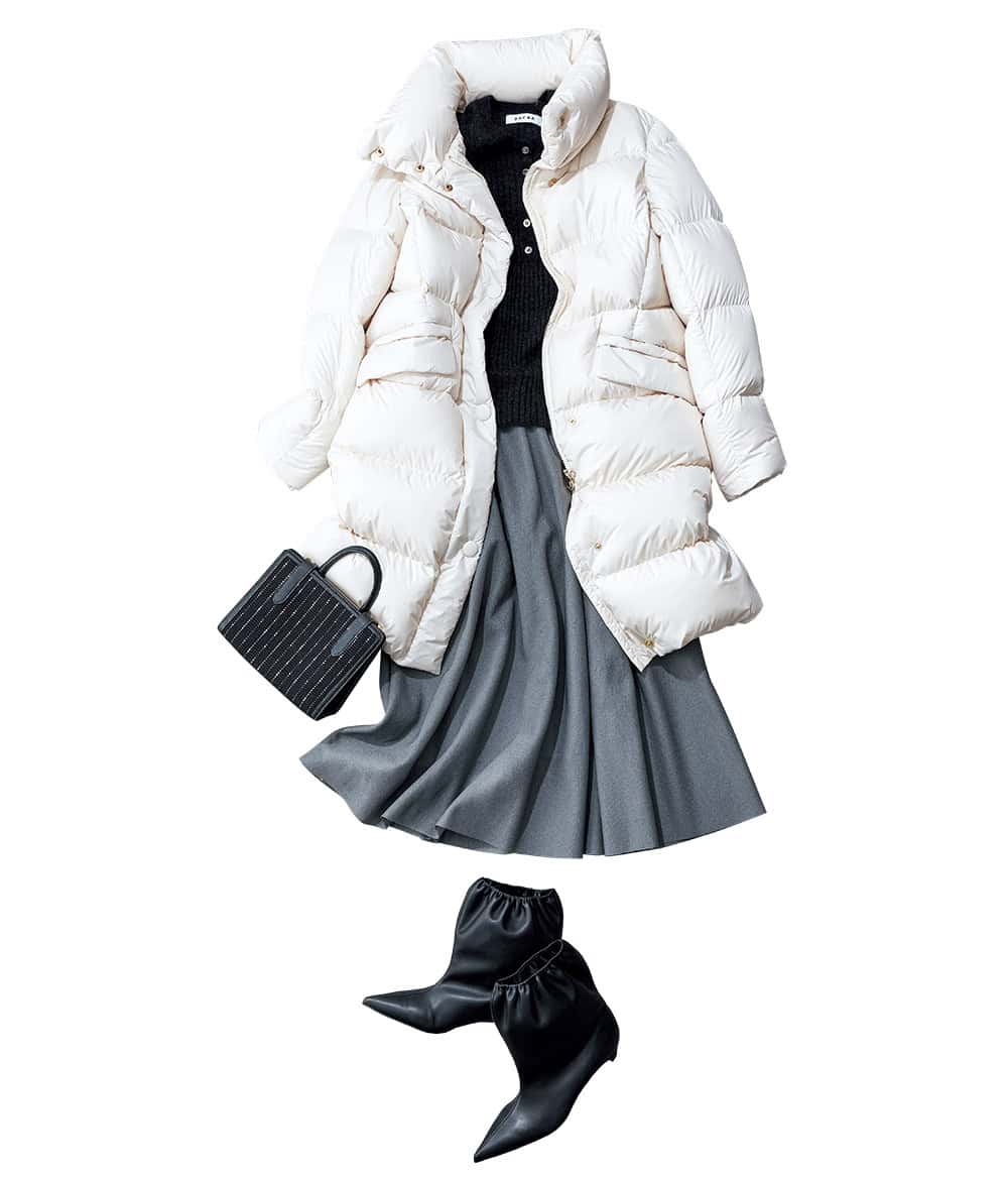 <着回し例>シンプルなワンツーコーデを上品カジュアルに格上げ。ホワイトダウンコート¥97,900(ケープホーン/ティースクエア プレスルーム)ニット¥42,900(サクラ/インターリブ)スカート¥79,200(ADORE/ADORE 六本木ヒルズ店)バッグ¥79,200(ストラスベリー)ブーツ¥46,200(ピッピシック/ユナイテッドアローズ 六本木ヒルズ店)