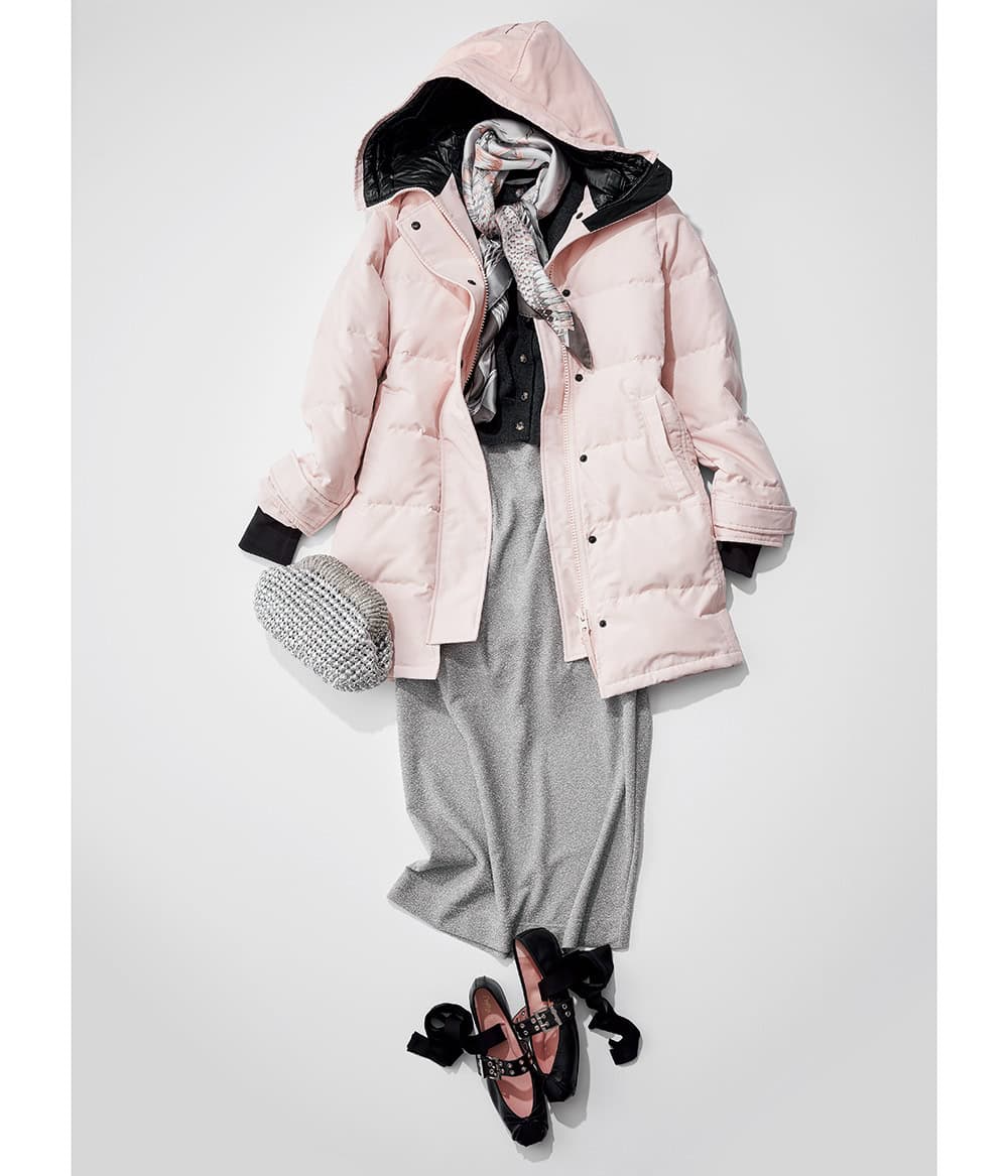 <コーデ例>ピンクダウンコート¥242,000(カナダグース/カナダグースジャパン)ニット¥57,200(LOWER/ショールーム セッション)ラメスカート¥15,950(ジネス/ジオン商事)スカーフ¥22,000(マニプリ)バッグ¥55,000(ノアム ハザン/ティースクエア プレスルーム)シューズ¥60,500(プリティ・バレリーナ/F.E.N.)