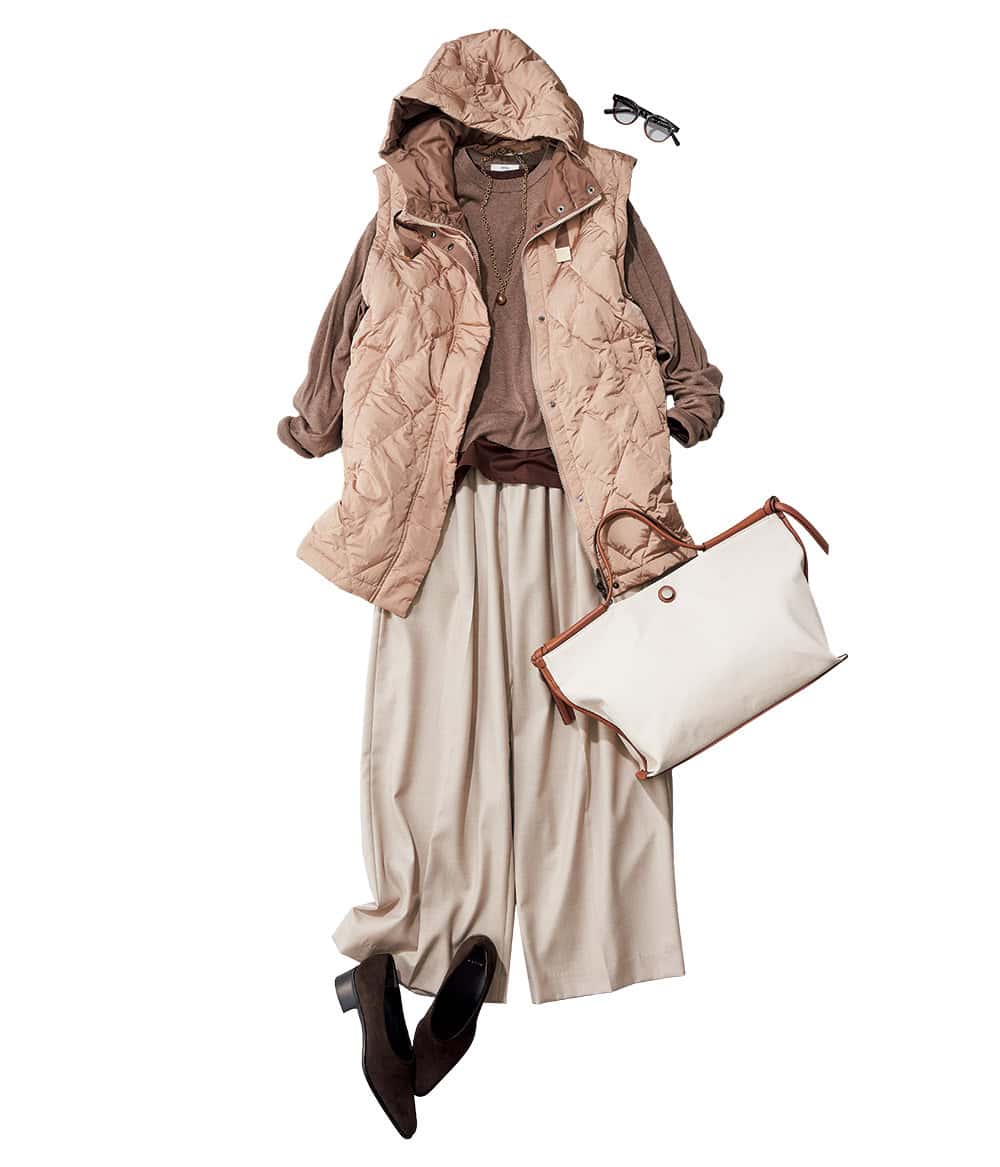 <着回し例>ダウンベストのレイヤードでワントーングラデに奥行きを。2WAYダウンジャケット¥59,400(YOSOOU/ジョワイユ)ニット¥49,500(エイトン/エイトン青山)ロングスリーブカットソー¥28,600(タトラス/タトラス 銀座店)ワイドパンツ¥49,500(POSTELEGANT/ポステレガント)バッグ¥27,500(サムウェア ストゥディオ/エリオポール代官山)パンプス¥63,800(カチム)メガネ¥46,200(アイヴァン/アイヴァン 東京ギャラリー)ネックレス¥21,780(チビ・ジュエルズ/ZUTTOHOLIC)