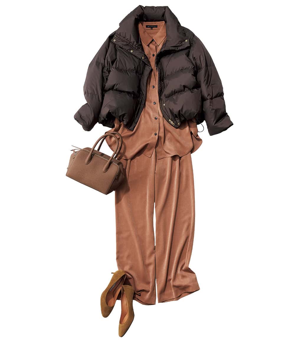 <着回し例>タイパなセットアップ合わせでダウンも簡単でスマートにキマる。ブラウンダウンジャケット[撥水]¥26,990(TAION×UNFILO/アンフィーロ)シャツ¥20,900パンツ¥23,980(ともに23区/オンワード樫山)バッグ¥53,900(ヴァジック/ヴァジックジャパン)パンプス¥59,400(ペリーコ/アマン)