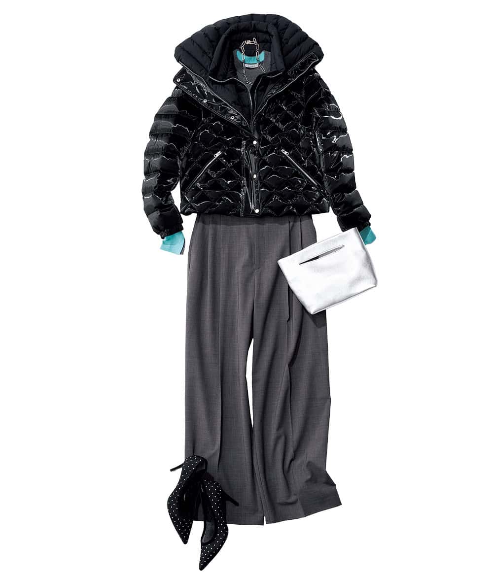 ブラックダウンジャケット¥184,800(マッカージュ/ジェイプラスインターナショナル)リブニット¥46,200ワイドパンツ¥29,700(ともにウィム ガゼット/ウィム ガゼット 玉川髙島屋S・C店)バッグ¥64,900(MIUUR/ショールーム セッション)パンプス[10月末発売予定]¥28,600(ツル バイ マリコ オイカワ)チェーンネックレス¥15,400(ダブルスタンダードクロージング/フィルム)