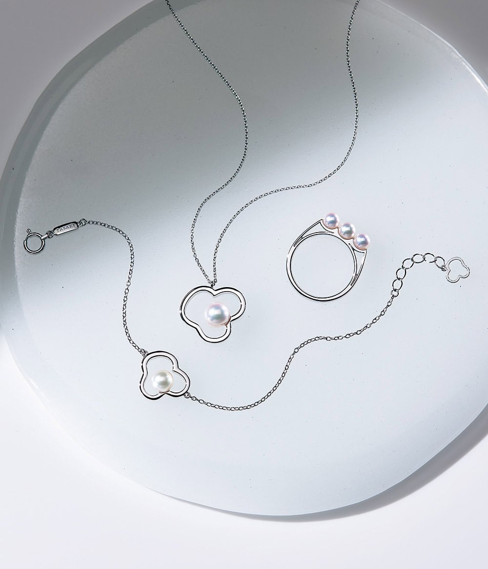 右から・リング「バランス」〈PT×アコヤ真珠〉¥236,500ペンダント「チャンツ」〈WG×あこや真珠×DIA〉¥308,000ブレスレット「チャンツ」〈WG×あこや真珠〉¥297,000(すべてTASAKI)
