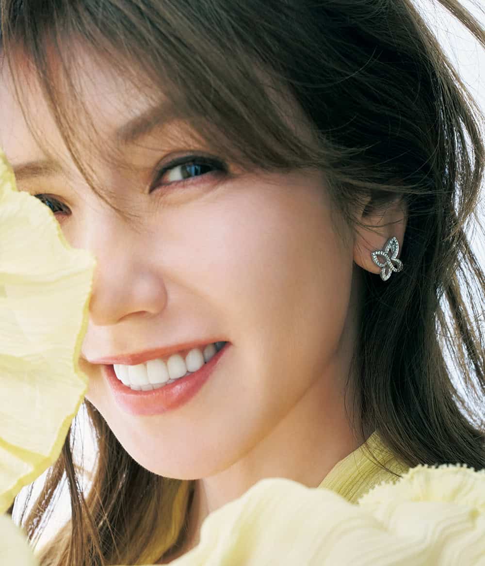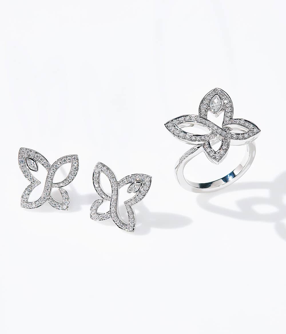 <物>躍動感のある蝶、百合の花を連想させる煌めきがSTORY世代を可憐に彩るリリークラスター。ひと際光を放つ、マーキースカット・ダイヤモンドが更なる高みに導いてくれます。右から・リング「インフィニット・リリークラスター」〈PT×DIA〉¥1,650,000 イヤリング「インフィニット・リリークラスター」〈PT×DIA〉¥2,167,000(ともにハリー・ウィンストン/ハリー・ウィンストン クライアントインフォメーション)
