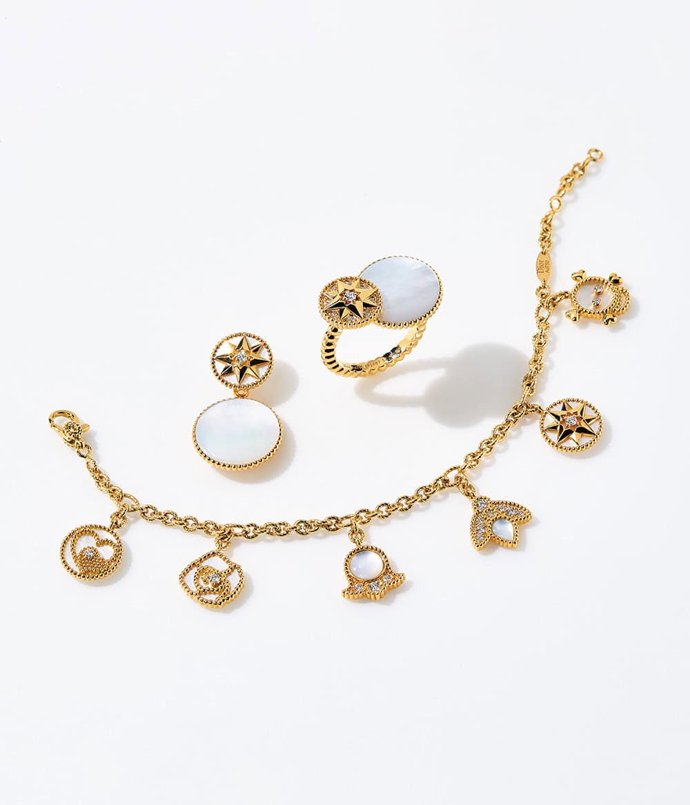 <物>ムッシュ ディオールにとってのタリスマンのようなシンボルをちりばめた「ローズ デ ヴァン」。卓越したクラフトマンシップが細部に宿るアイコニックなコレクション。右から・ブレスレット「ローズ デ ヴァン チャーム」〈YG×DIA×MOP〉¥1,900,000リング「ローズ デ ヴァン」〈YG×DIA×MOP〉¥1,150,000シングルピアス「ローズ デ ヴァン トライバル」〈YG×DIA×MOP〉¥720,000(すべてディオール ファイン ジュエリー/クリスチャン ディオール)