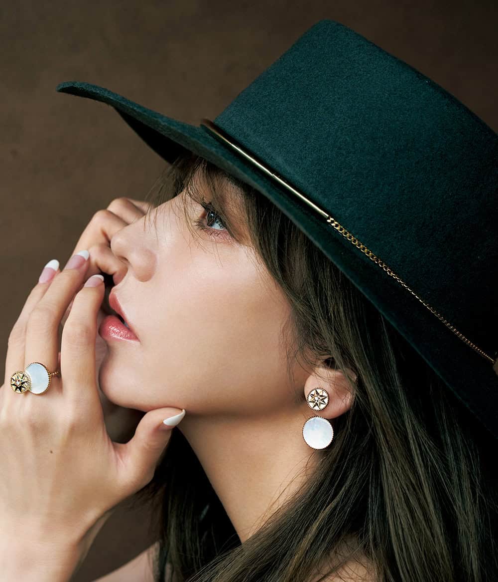 <人物>円形のマザーオブパールは、蟹座のムードである母性を象徴。挑戦したい時に守ってくれます。シングルピアス「ローズ デ ヴァン トライバル」〈YG×DIA×MOP〉¥720,000リング「ローズ デ ヴァン」〈YG×DIA×MOP〉¥1,150,000(ともにディオール ファイン ジュエリー/クリスチャン ディオール)ハット¥23,100(フェリシオ ベッキ/THIRD MAGAZINE)