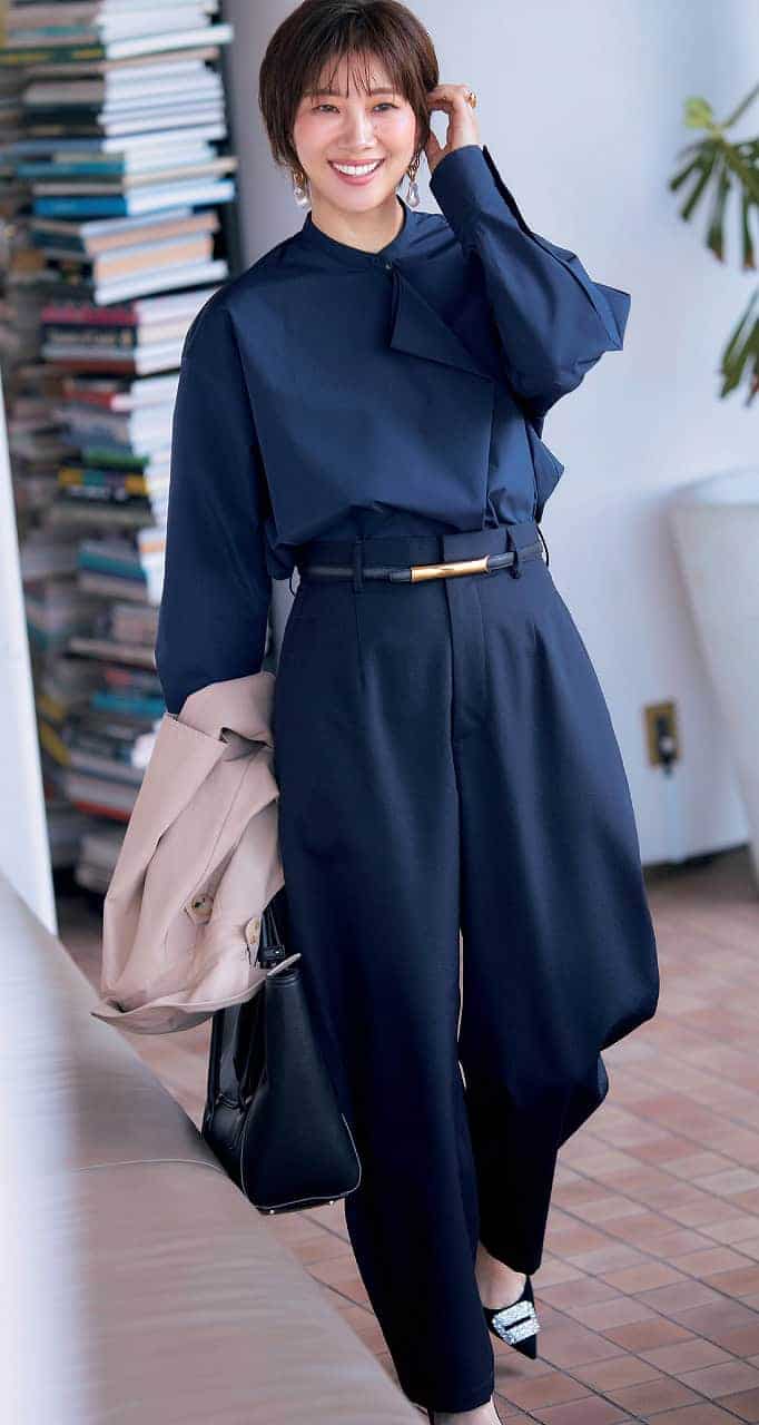 パンツ¥36,300(ロエフ/エイチ ビューティー&ユース)ブラウス¥27,500(hLM/ヒューエルミュージアム 表参道ヒルズ)コート¥66,000(ニコラ ジェンソン/リノウン)バッグ¥26,400〈アンドミューク〉靴¥97,900〈ペリーコ〉ベルト¥22,000(参考価格)〈アトリエ アンボワーズ〉(すべてアマン)ピアス¥16,500(ダブルスタンダードクロージング/フィルム)リング¥51,810(参考価格)(オーガスト)