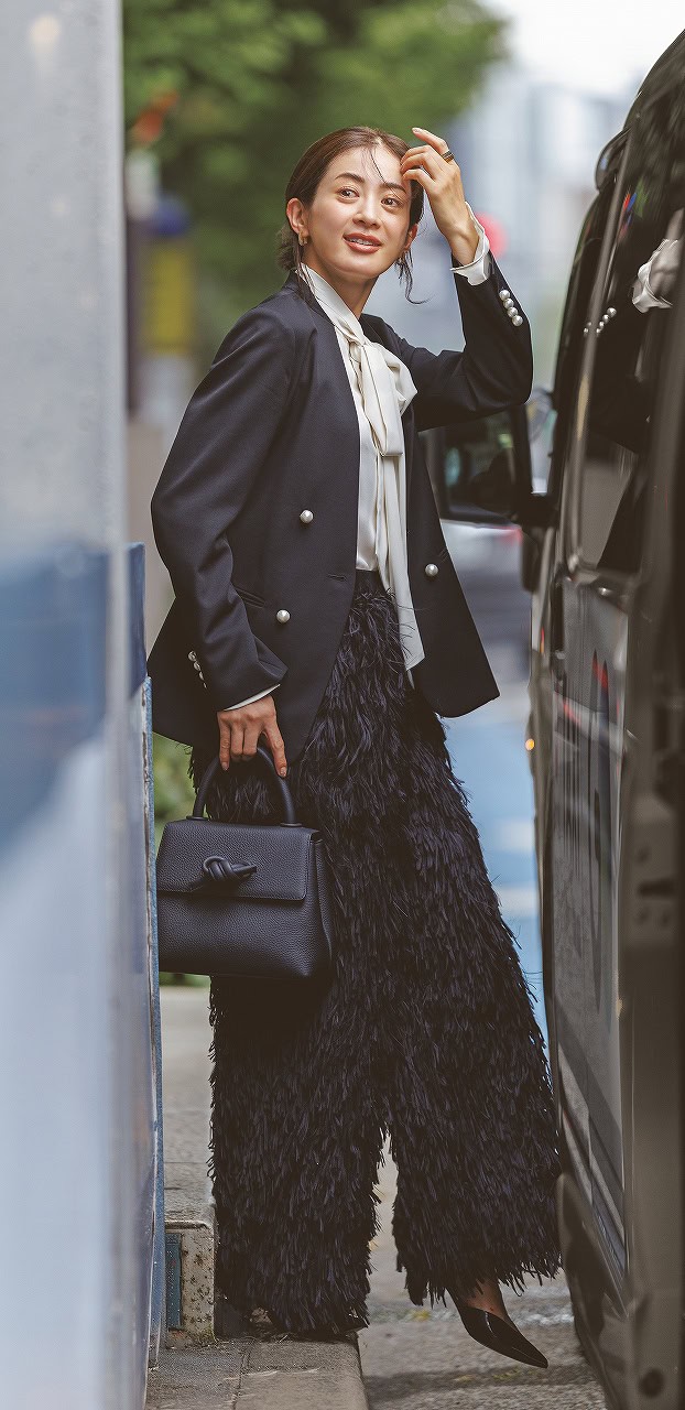 動くたび揺れるシャギーの質感が、きれいめジャケットをガラッと華やかに。ネイビーでまとめることで、モードと上品さを両得。ボウタイやパールの甘要素を盛り上げてくれます。