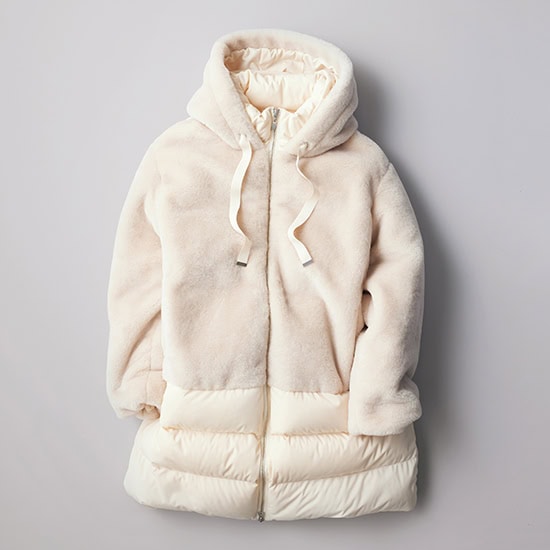 ➀きれいめ派の心を掴むデティールが詰まった、異素材MIXダウンコート