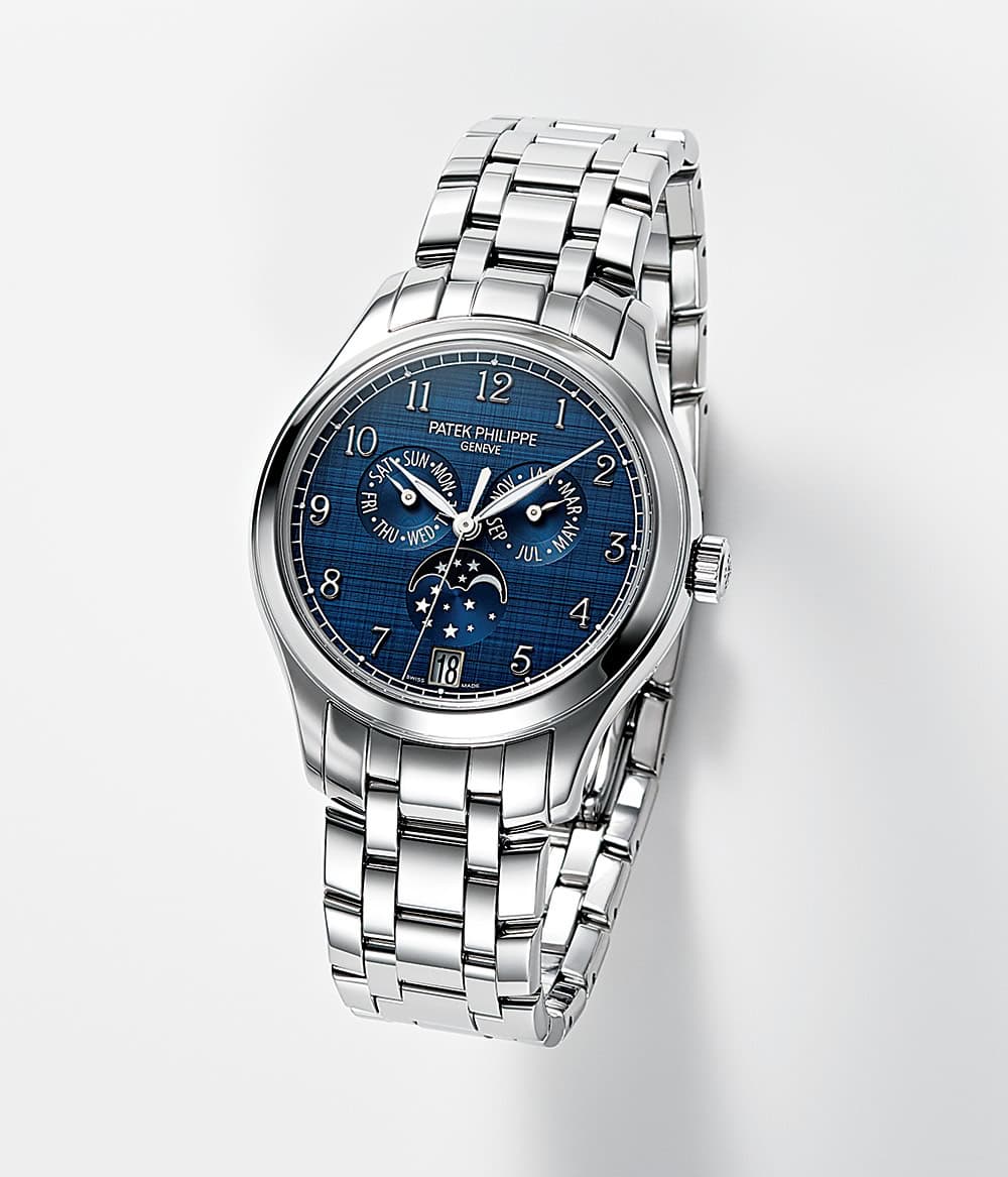 ギョーシェ彫りの装飾が施されたシグネチャーダイアル。6時の位置にナイト&デイ表示が付いた複雑式機構でアラビア数字のインデックスの先に配されたワンポイントダイヤがアクセントに。