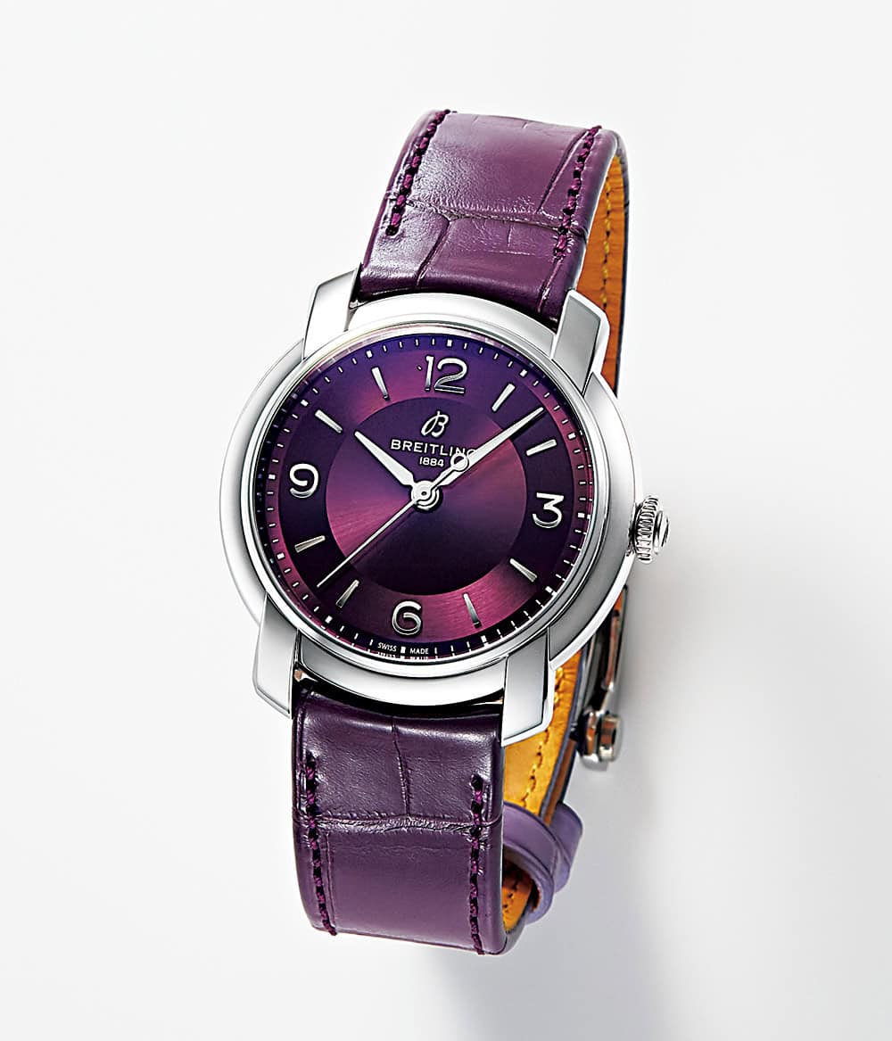 淡いパープルの上品な顔立ちの文字盤は製造地の岩手県の県花「桐」から着想されたカラー。36.5㎜径のミドルケースは、日本女性の華奢な手首に程よくフィットするサイズ感です。