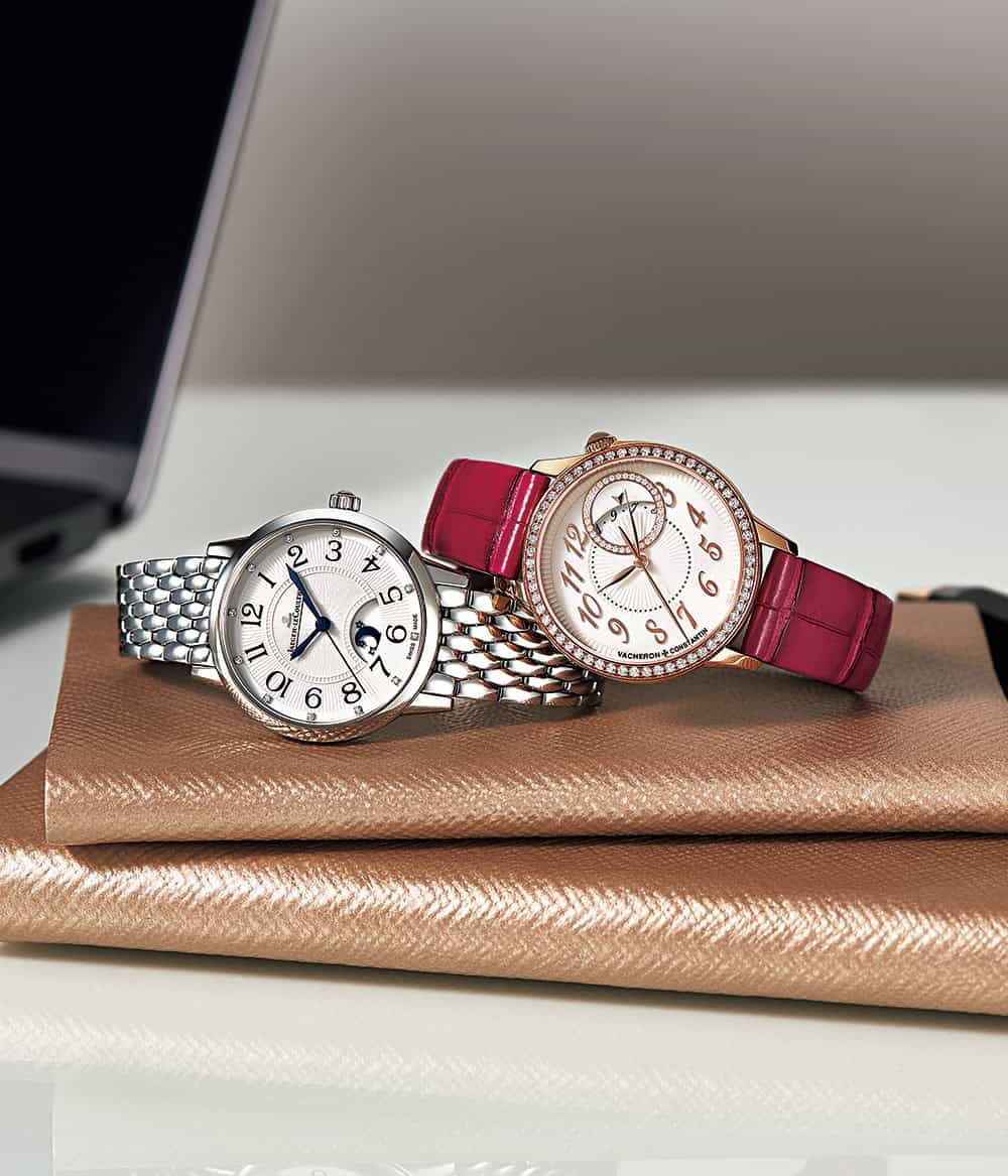 時計左「ランデヴー・クラシック ナイト&デイ」〈SS、34㎜、自動巻き、SSストラップ〉¥2,094,400(ジャガー・ルクルト)時計右「エジェリー・オートマティック」〈18KPG×DIA、35㎜、自動巻き、アリゲーターストラップ〉¥5,412,000(ヴァシュロン・コンスタンタン)ノート(小)¥13,650(大)¥37,800(ともにスマイソン/ルック(スマイソン))ペン スタイリスト私物