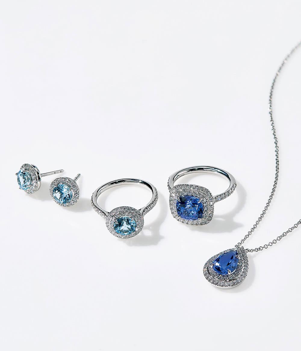 「いつも目に入る手元のジュエリーは〝好き〟を重ねて多忙な毎日にご自愛を。大好きなブルーの色石を贅沢にグラデーション。光を取り込み、角度によって表情を変える。そんな佇まいに癒しと高揚感をもらえます」(モデル・蛯原さん)