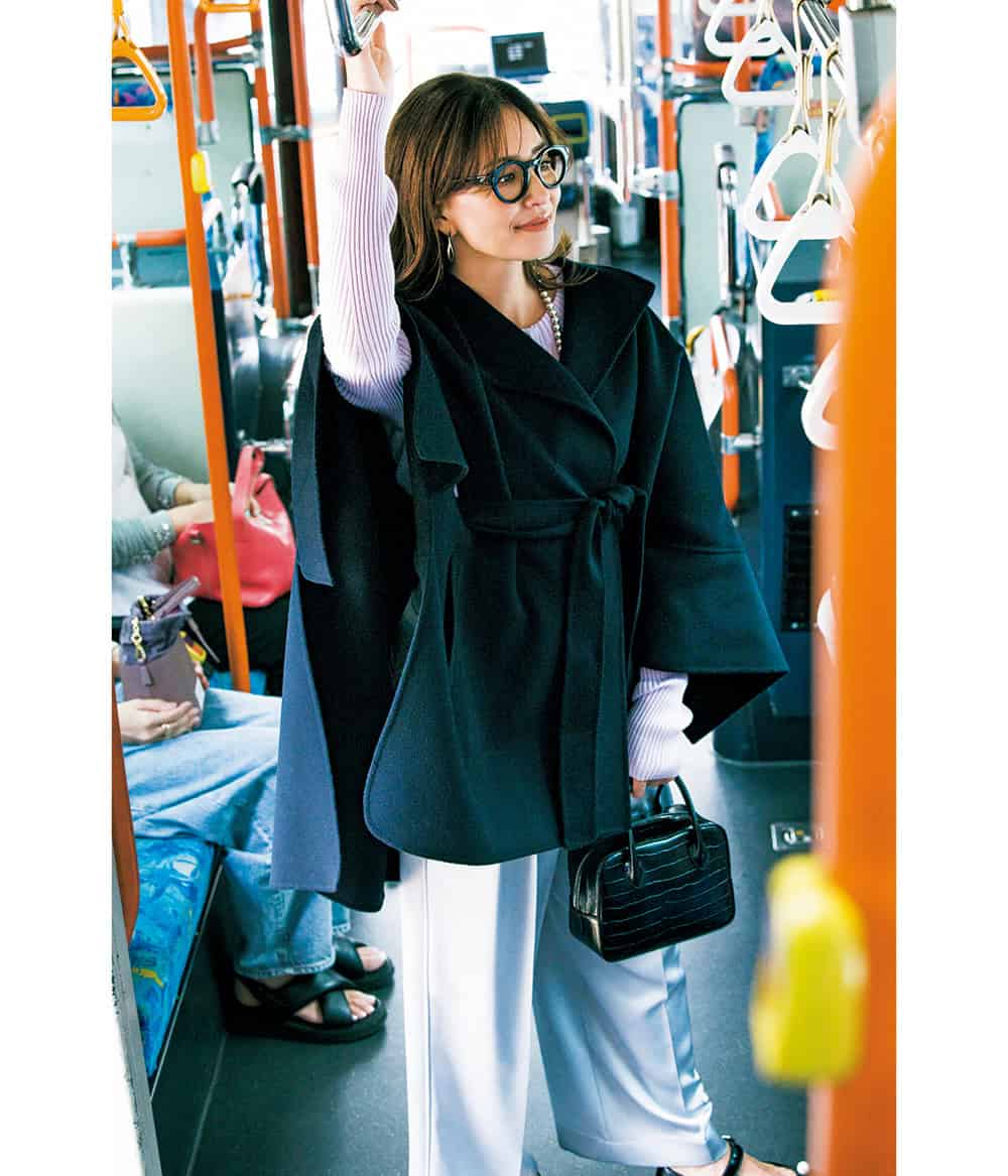 ケープコート¥99,000(エストネーション/エストネーション)ニット¥25,960(イウエン マトフ/ユナイテッドアローズ 渋谷スクランブルスクエア店)パンツ¥25,300(アンクレイヴ)バッグ¥82,500(メゾン カナウ/ヤマニ)メガネ¥49,500(モスコット/モスコット トウキョウ)ピアス¥47,300(リューク)ネックレス¥58,080(ペヨテ・バード・デザイン/ZUTTOHOLIC)