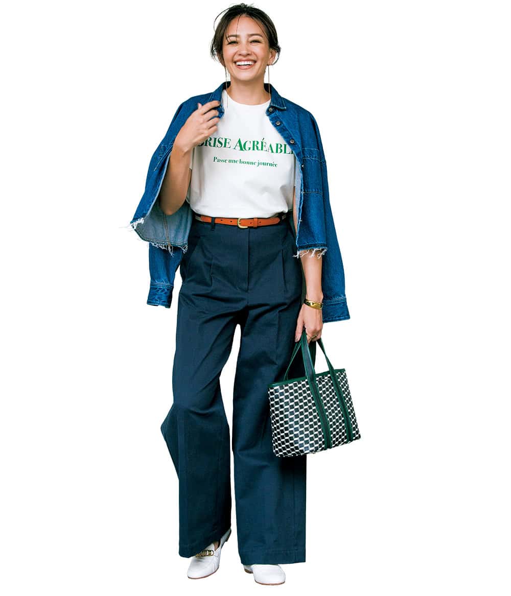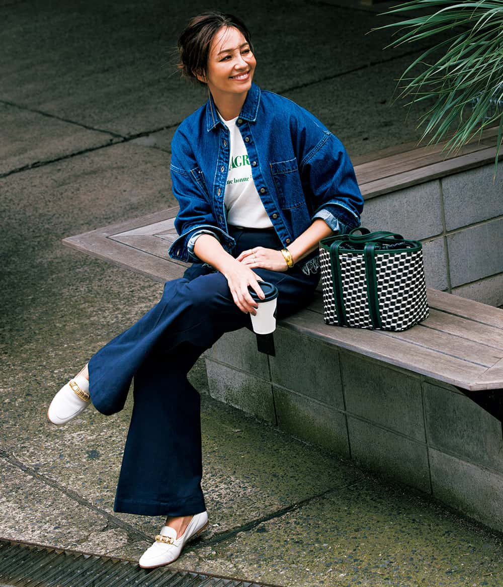 デニムシャツジャケット¥42,900(サクラ/インターリブ)Tシャツ¥9,790(マイストラーダ/マイストラーダ プレスルーム)パンツ¥33,800(テラ/ティースクエア プレスルーム)バッグ¥207,900(ピエール アルディ/ピエール アルディ 東京)シューズ¥135,300(トッズ/トッズ・ジャパン)ベルト¥31,900(RH ヴィンテージ/ロンハーマン)ピアス¥25,300ダブルリング¥40,700(ともにリューク)バングル¥41,580(ソコ/ZUTTOHOLIC)